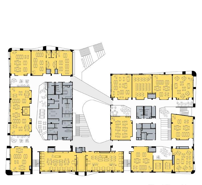 Following the principle that “learning happens everywhere” every area within its large floor plates is seen as a learning space. Hallways are replaced with freeflowing, media-rich Student Commons areas for student-led activity and interaction. Classrooms are scaled up to simultaneously allow multiple modes of hands-on learning, and connected to the Commons by generous folding glass doors. Access to upper floors brings students together in a grand series of habitable welcome-stairs. Administrative functions for students are placed at the center of student life on each floor.