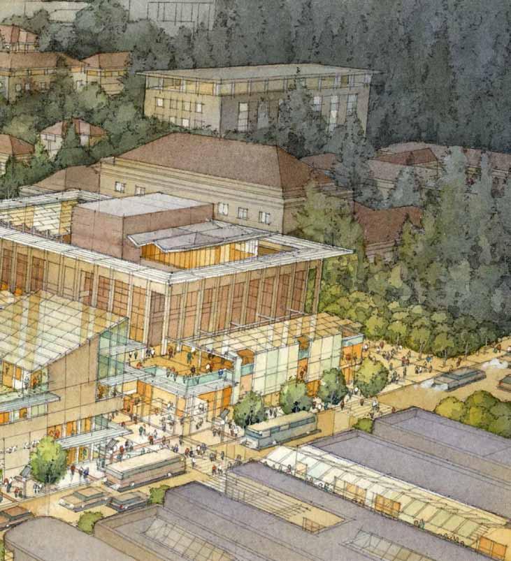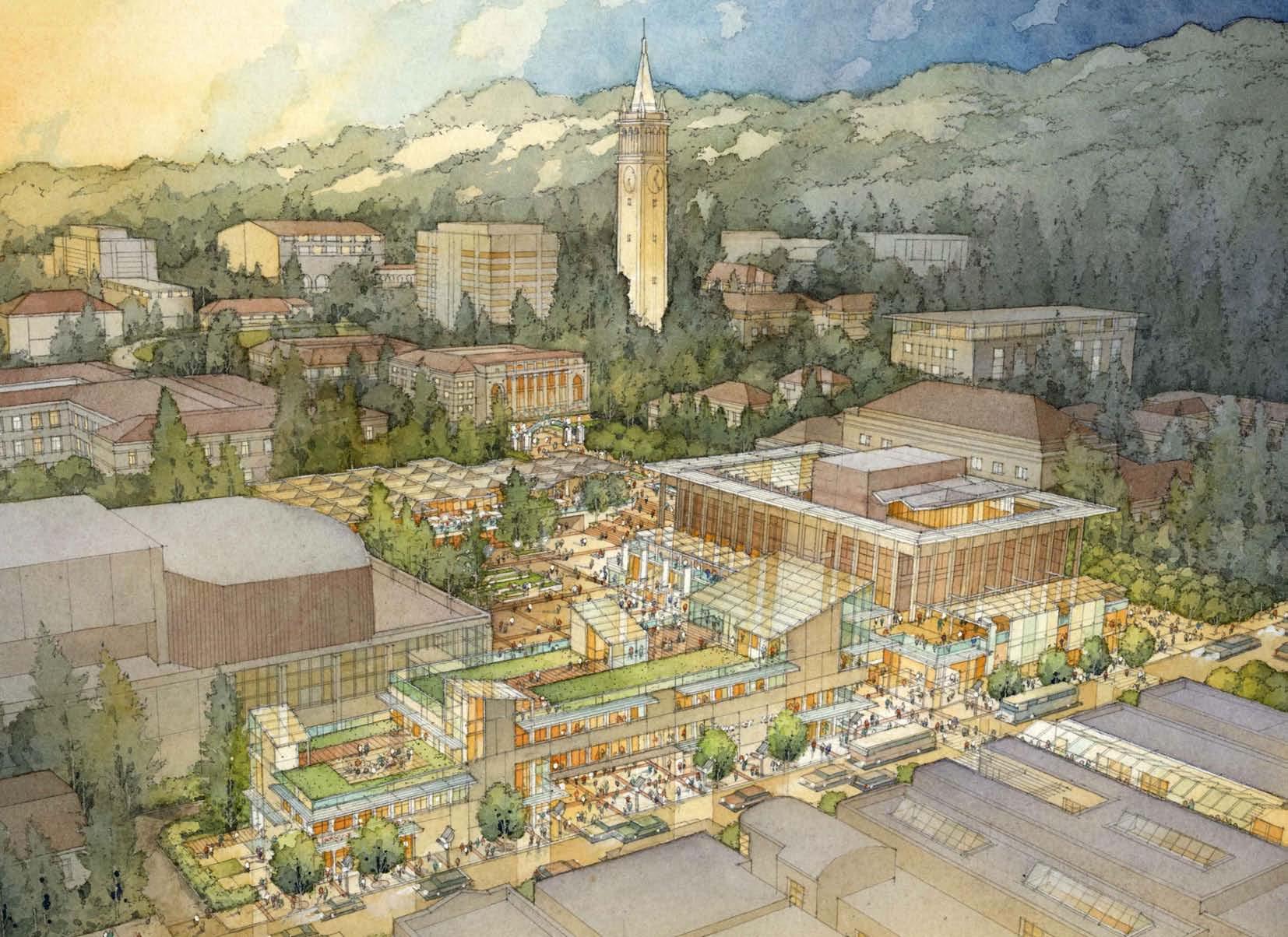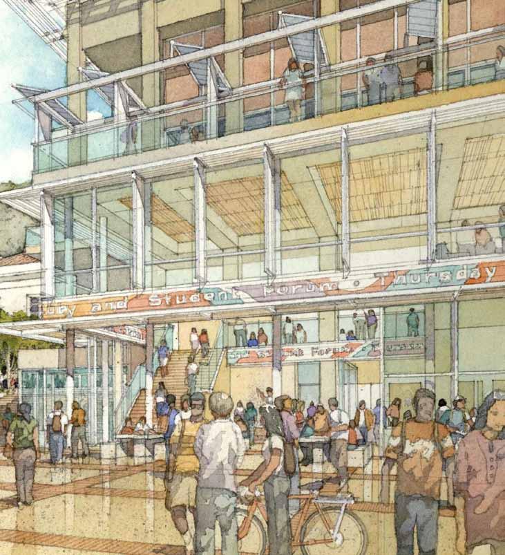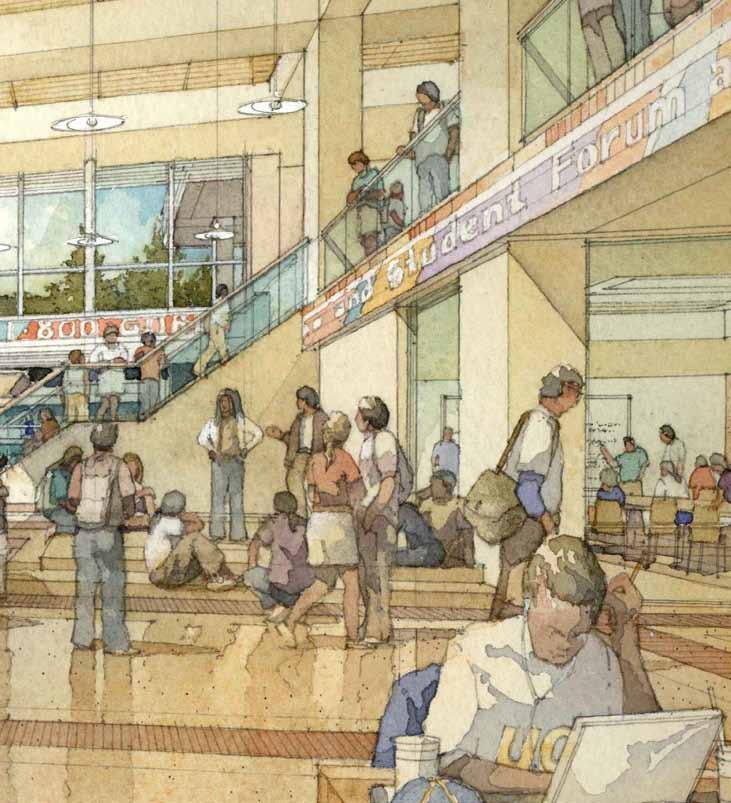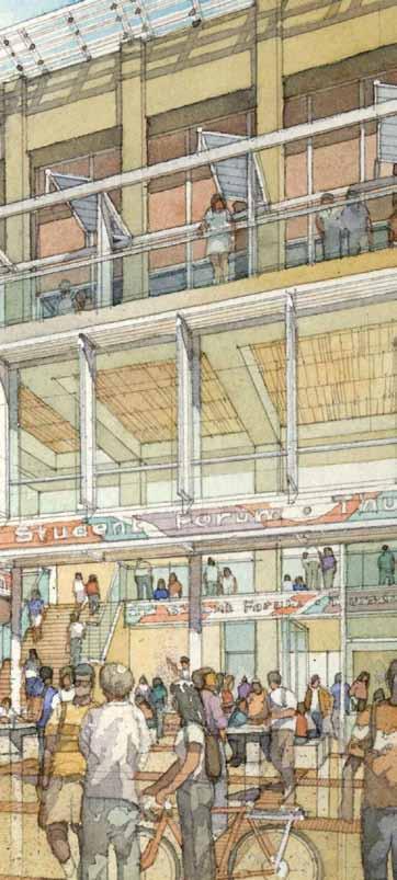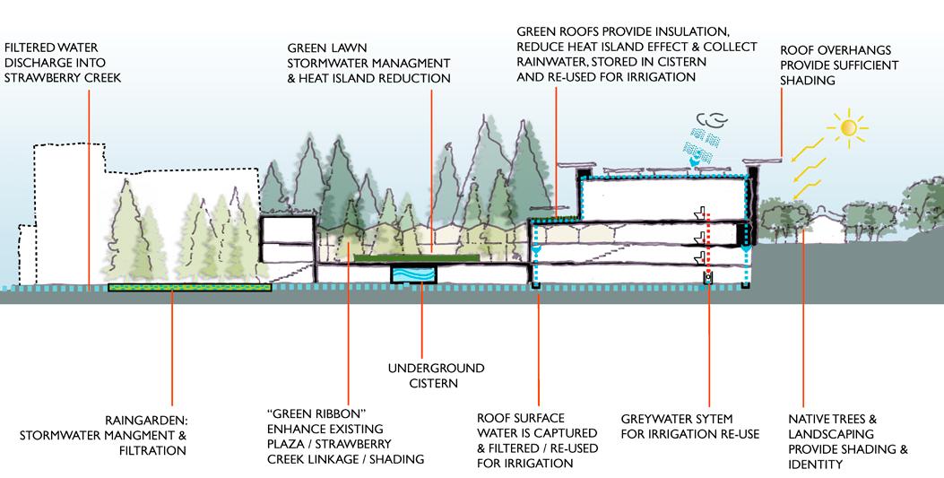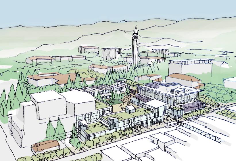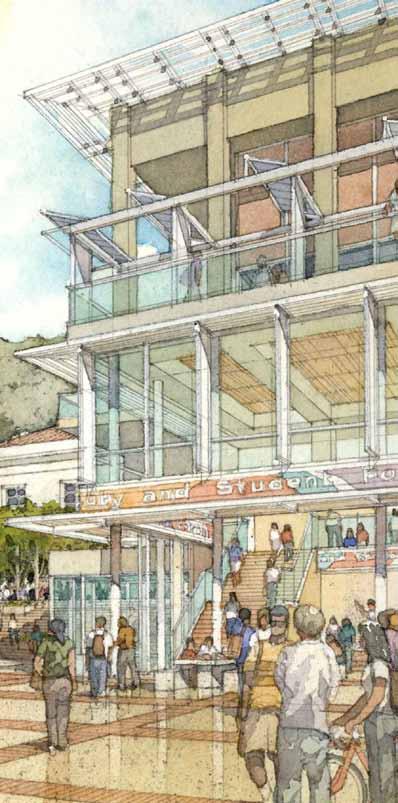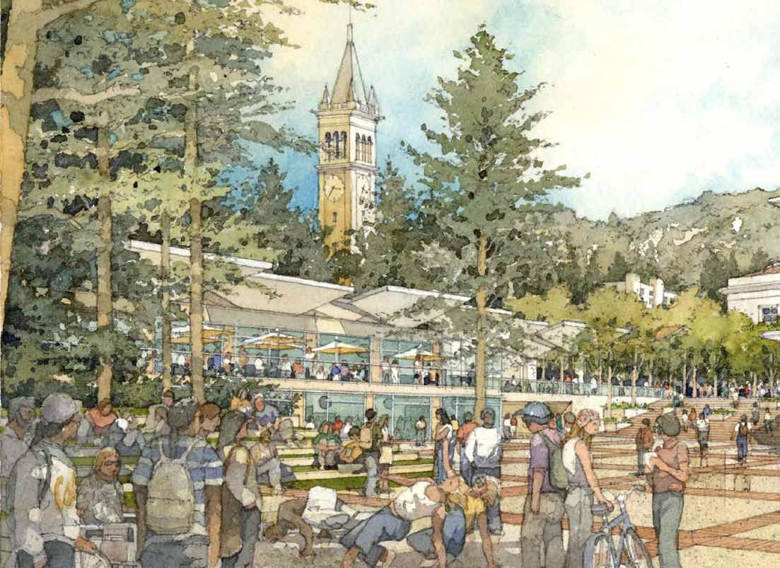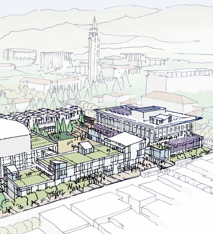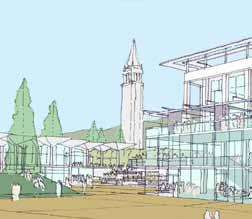 in need of programmatic and physical redesign in order to provide undergraduate and graduate students with a high quality facility for student life appropriate for today’s environment at Cal. Moreover, the new Student Community Center acknowledges its location as the threshold between campus and community, and academics and commerce. As one of the main entrances to the campus, it projects the values of the university while being a good neighbor to the city. It embodies the spirit and aspirations of the students and visitors and celebrates the campus tradition of inclusive multiculturalism and the protection of free speech. The SCC also embraces the movement towards a sustainable future where awareness of our ecological challenges is prominently featured through operational practices that support good stewardship of the environment.