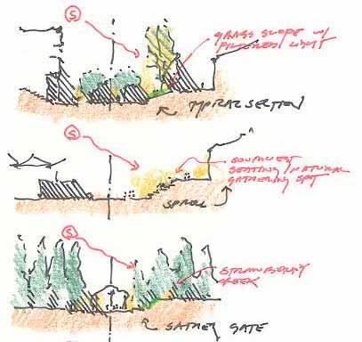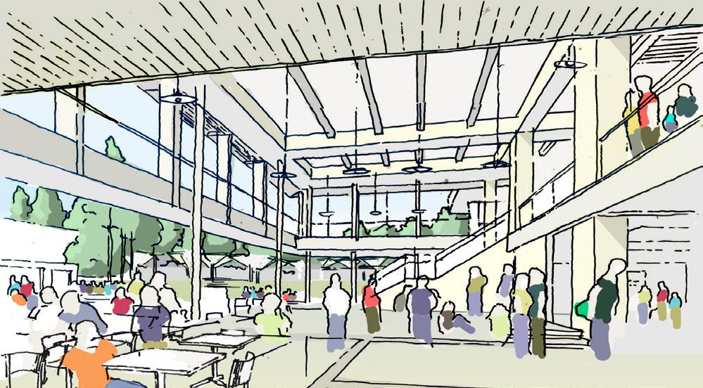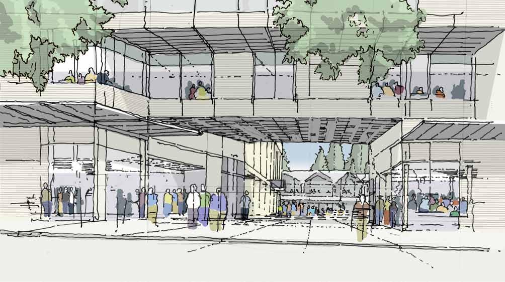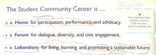 The SCC is a home for renewal, participation, and performance. As a home it is an easily found destination that welcomes students and brings to them a sense of belonging, ownership, shelter, and safety where a variety of activities happen day and night. It is both a comfortable living room and an enticing dining venue where healthy, locally grown food is served or purchased from a daily farmer’s market. A choice of micro-climates whether it be full winter sun, dappled fall shade, or cozy interior perch, provide an environment for