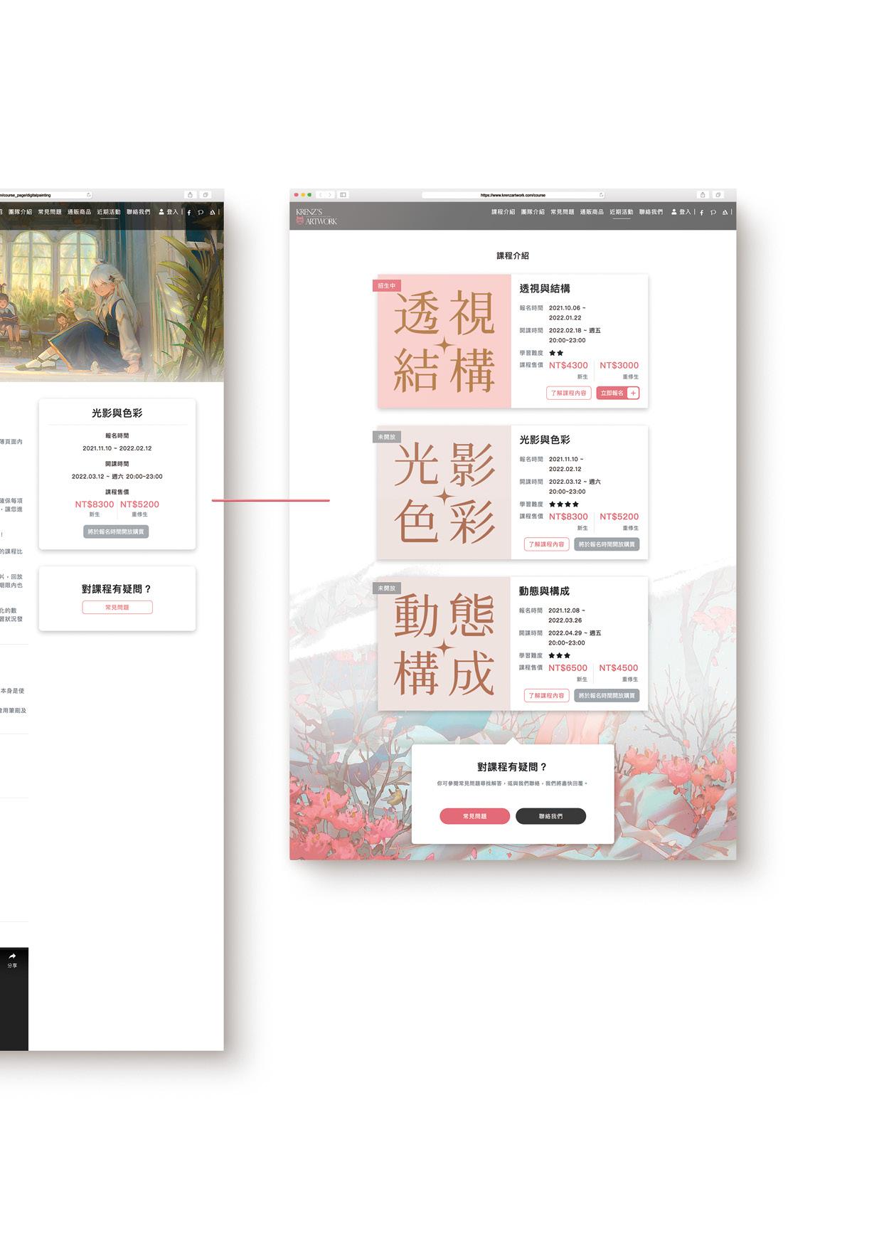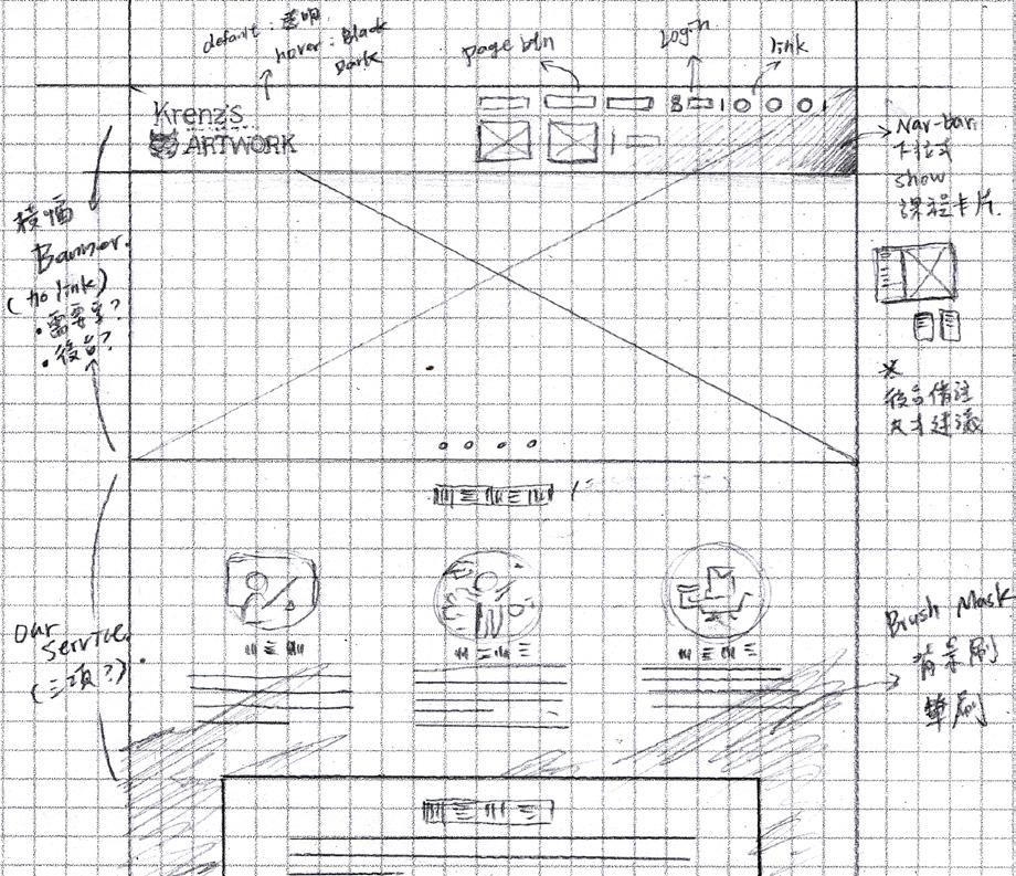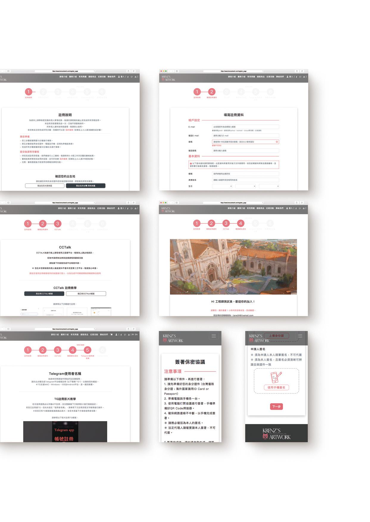 Krenz's Artwork 是我首次參與設計結構較複雜的中型網站 , 從 最初客戶端的需求蒐集 、 整理與資料分析 , 到網站架構該如何 部署 、 使用者操作流程的規劃與各頁面的介面設計 , 在這個過 程中 , 該如何與客戶溝通 、 釐清需求 ; 沙盤推演用戶問題 、 找 出淺藏的隱性需求;與工程師協作 ,在每個環節都有新的考驗 , 也促使我改變及修正過往的思考方式與工作模式 。
