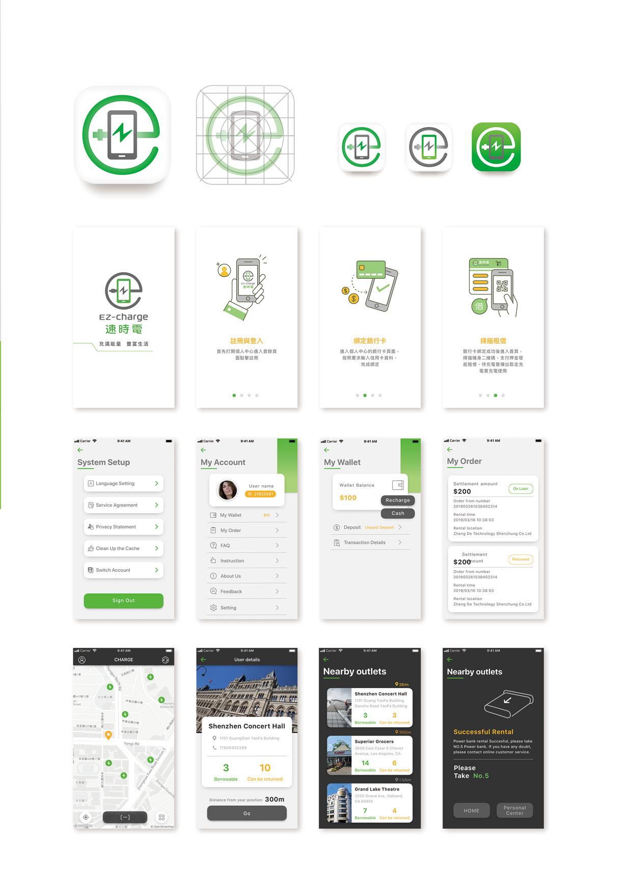 EZ-charge 提供租借行動電源的服務 , 以 IOS 用戶為主 , 客戶 希望 APP 操作介面看起來能簡單 、 乾淨 、 大方 , 因此引導頁 的插圖以乾淨線條來繪製 。 而頁面部分 , 則區隔為 「 資料區 」 與 「 功能區 」, 資料區包 含 APP 設定 、 FAQ 、 使用者帳戶……等等頁面 , 以大量淺灰與 留白為主 ; 功能區則是實際租借使用時會觸及的頁面 , 則改 以深色為主 , 並搭配卡片來群組各個重要資訊 。