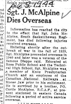 Moose Jaw Boys Who Died at Verrières Ridge Lance Corporal Norman Brinsdon, SSR, 1038 Athabasca Street East, Moose Jaw.