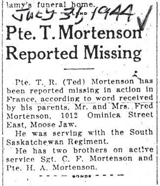 Ralph Mortenson, L/100513, age 20, son of Clifford F. and Alice Mortenson, of Moose Jaw, Saskatchewan.