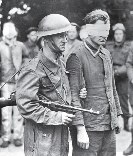 An unidentified Canadian soldier, who is armed with a Thompson machine gun, escorting a German prisoner who was captured during Operation JUBILEE, the Dieppe raid. England, 19 August 1942. Photo taken in England. Library and Archives Canada #3592340
