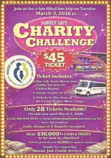 EVERY THURSDAY: Ladies Auxiliary “Meat Draw” – ticket sales start at 5:30 pm, draws start at 6:00 pm –Meat Draw, 50/50, “Chase the Ace” EVERY SUNDAY: Aerie “Meat Draw” – ticket sales start at 2:30 pm – Meat Draw, 50/50, Mystery Draw, “Chase the Ace” MONDAY THRU SATURDAY – DROP IN POOL –1:00 pm to 1:30 start time. Singles and Doubles. Partners draw from those attending to play. FIRST AND THIRD SUNDAY – Aerie meeting – 11:30 am FIRST AND THIRD TUESDAY – Ladies Auxiliary meeting - 7:00 pm Western Development Museum; 50 Diefenbaker Drive, Moose Jaw. For more information, visit the museum’s website at WDM.ca/Moose-Jaw. Call 306-693-5989 or email ajones@wdm.ca. Community Heritage Day: Guests are invited to the museum to celebrate the history of Moose Jaw and Saskatchewan at the upcoming Community Heritage Day, set for Feb. 21 from 1 to 4 p.m. at the WDM. The event will feature historical information, heritage demonstrations, and family-friendly activities. Regular museum admission applies and there is no charge to take part in the activities in the lobby area and Sask Hall. The event is sponsored by the Saskatchewan Festival of Words, Moose Jaw Public Library, Prairie Hearts Quilters’ Guild, New Southern Plains Métis Local No. 160, and the Association communautaire fransaskoise de Moose Jaw