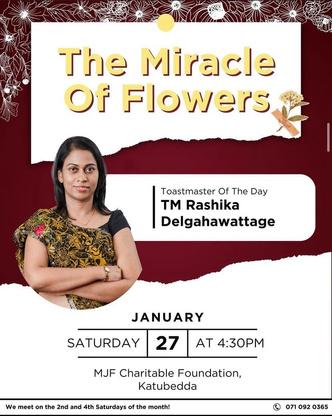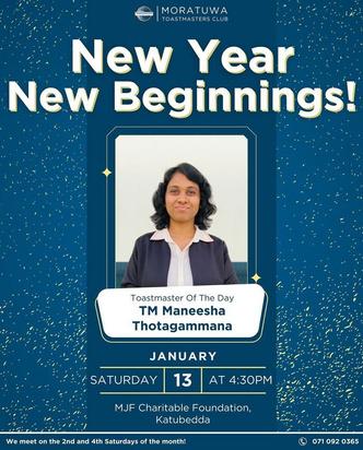 Our recent meetings have been a testament to the commitment of your members to personal and professional development. In the spirit of growth, the energy and the inspiration in the club meetings have been nothing short of electrifying It is heartening to see new faces joining us, eager to embark on their Toastmasters journey, as well as seasoned members continuing to refine their communication and leadership skills I want to take a moment to applaud your club members for their participation in various roles during meetings. Your willingness to step out of your comfort zone, whether taking on a prepared speech, evaluating, or leading as a Toastmaster of the Day, is what makes your club thrive. Remember, each role you undertake is a step forward on your path to mastery, and I encourage everyone to continue challenging themselves In the spirit of continuous improvement, let us also focus on providing constructive feedback. Let us ensure that our evaluations are not just a formality but a genuine effort to help our fellow Toastmasters grow. A well-crafted evaluation has the power to inspire and guide, so let us make every feedback session count Looking ahead, let us focus on setting and achieving our personal and collective goals. Moratuwa Toastmasters Club is not just a place to overcome the fear of public speaking; it is a community where we empower each other to reach new heights and unleash our full potential.