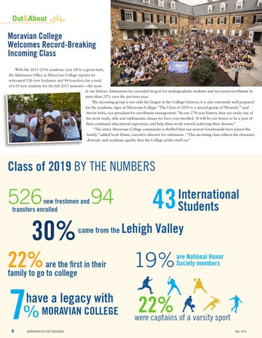 Moravian College Welcomes Record-Breaking Incoming Class With the 2015-2016 academic year off to a great start, the Admission Office at Moravian College reports we welcomed 526 new freshmen and 94 transfers, for a total of 619 new students for the fall 2015 semester—the most in our history. Admissions far exceeded its goal for undergraduate students and increased enrollment by more than 25% over the previous year. The incoming group is not only the largest in the College’s history, it is also extremely well-prepared for the academic rigor at Moravian College. “The Class of 2019 is a special group of ‘Hounds,’” said Steven Soba, vice president for enrollment management. “In our 274-year history, they are easily one of the most ready, able and enthusiastic classes we have ever enrolled. It will be our honor to be a part of their continued educational experience and help them work toward achieving their dreams.” “The entire Moravian College community is thrilled that our newest Greyhounds have joined the family,” added Scott Dams, executive director for admission. “This incoming class reflects the character, diversity and academic quality that the College prides itself on.”