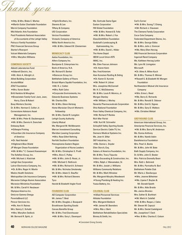 Comenius Society Abbott Laboratories Fund «Albarell Electric, Inc. «Mr. Alvin A. Albright Jr. Allied Building Corporation ArcelorMittal AT&T Foundation «Mrs. Karen Bader Britt Hankins & Moughan «Brownstein Family Fund: Jack, Joan, Harry, Clara & Robert Busy Workers Society Dr. & Mrs. Herman E. Collier Jr. Cornerstone Advisors Asset Management, Inc. «Mr. & Mrs. Peter B. Daubenspeck «Mr. & Mrs. Dennis A. Domchek Embassy Bank «Gillespie Printing «Guardian Life Insurance Company of America «Dr. Ned Heindel «Highmark Blue Shield JP Morgan Chase Foundation «Mr. & Mrs.* C. Cassard Kaesemeyer The Kafafian Group, Inc. «Mr. Michael J. Klatchak Lehigh Gas Corporation Lutron Electronics Company, Inc. «Dr. & Mrs. Roger H. Martin Medco Health Solutions Metropolitan Life Insurance Company Moravian College Alumni Association Moravian Ministries Foundation Mr. & Mrs. Caroll H. Neubauer Olympus America Inc. Omicron Gamma Omega ParenteBeard LLC Pencor Services Inc. «Ms. Ann H. Raines Mrs. Nancy C. Schultz «Mrs. MaryAnn Sedlock Mr. Bernard R. Spirk, Jr.