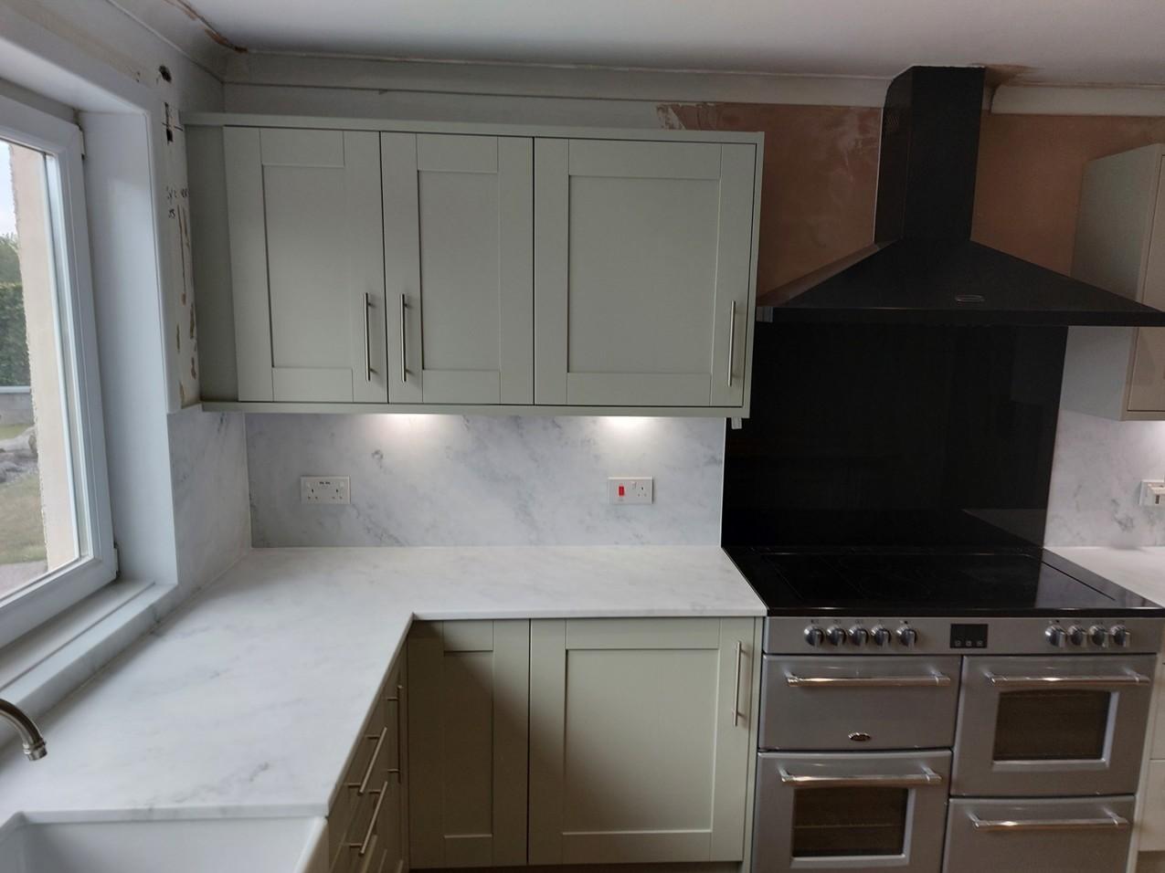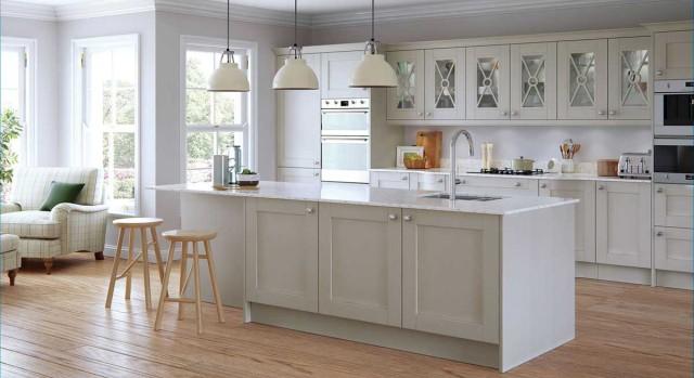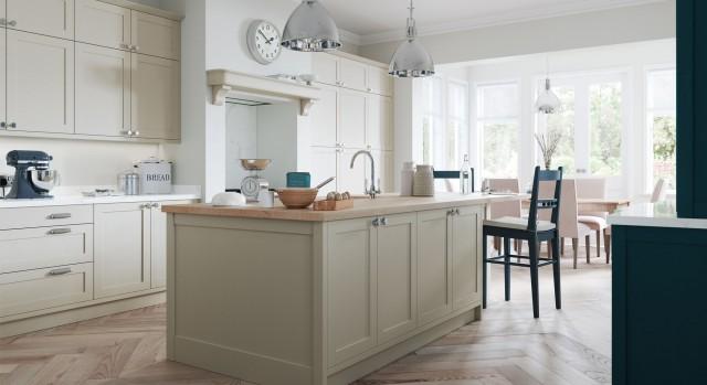 Dawson’s slim frame, sloped internal profile and v-groove detailing offer a unique design that can adapt to suit both contemporary and traditional styling. Featured here using mock inframe, glazed doors and open shelves to create lots of detail and interesting focal points. Available colours shown on the left.