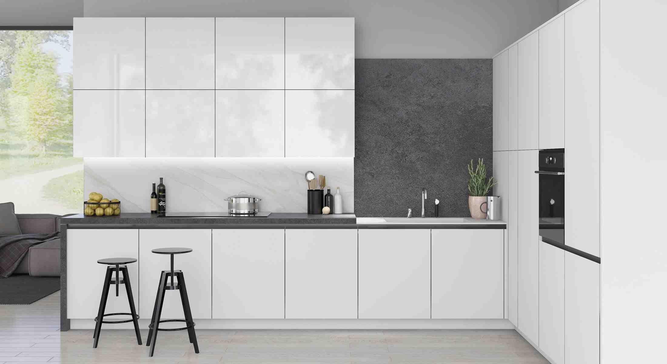 The marble veined effect of minerva® Carrara White has a unique charm that works as well in contemporary and traditional kitchens.