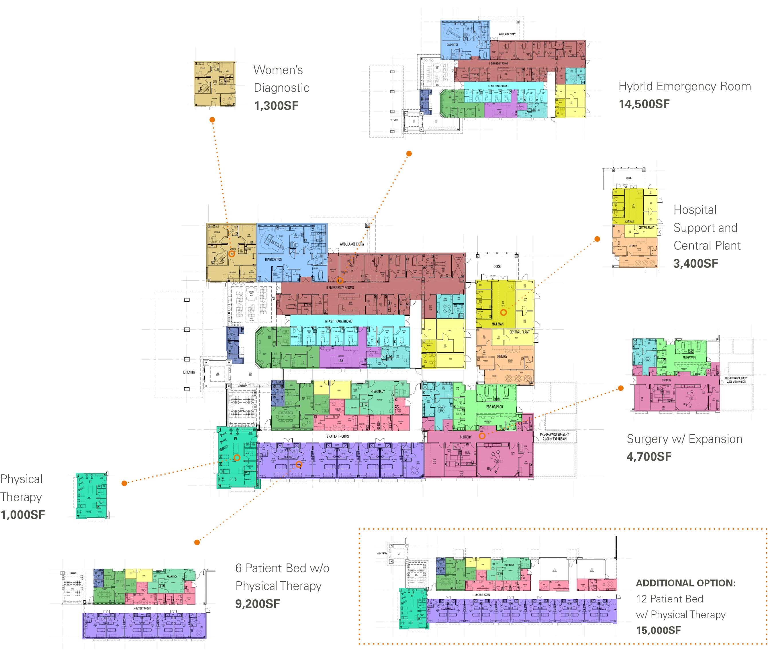 E4H understands that a uniform hospital size will not meet the demands of every community. That is why we have designed an expandable, modular floor plan to support the unique needs and available space of each location. As illustrated, our free standing emergency departments (FSED) and neighborhood/microhospitals are scalable and expandable depending upon the desired modalities.