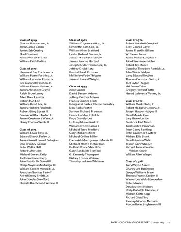 Class of 1972 William Prigmore Aiken, Jr. Kenneth Sears Coe, Jr. William Allen Brafford Leslie Holland Garner, Jr. James Meredith Haley IV James Jerome Hartzell Joseph Baylor Henninger, Jr. Jeffrey David Katz Randall Neal Pittman McKinley Wade Thigpen James Howard Wright Class of 1973 Anonymous David Benson Adams Jeffrey Prather Adams Francis Charles Clark Douglass Charles Ellerbe Farnsley Don Parks Foster Samuel Richard Freeman Henry Lockhart Hinkle Page Gravely Lea L. Joseph Loveland, Jr. William Ernest Lucas II Michael Terry Medford Gary Michael Miller Michael Collins Miller Frederick Montgomery Morris III Michael Monte Richardson Delbert Bruce Shortliffe Gary Randolph Stafford G. Kennedy Thompson Rickey Connor Weisner Timothy Jackson Whitener
