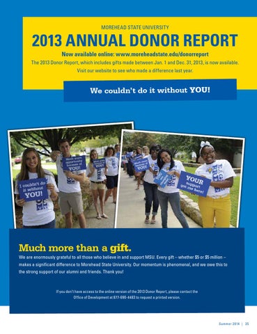 2013 ANNUAL DONOR REPORT Now available online: www.moreheadstate.edu/donorreport The 2013 Donor Report, which includes gifts made between Jan. 1 and Dec. 31, 2013, is now available. Visit our website to see who made a difference last year.
