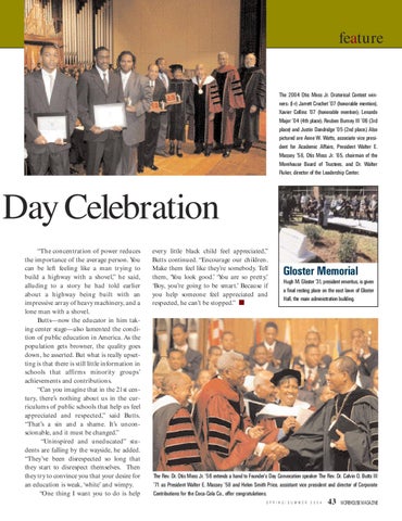 The Rev. Dr. Otis Moss Jr. ’56 extends a hand to Founder’s Day Convocation speaker The Rev. Dr. Calvin O. Butts III ’71 as President Walter E. Massey ’58 and Helen Smith Price, assistant vice president and director of Corporate Contributions for the Coca-Cola Co., offer congratulations. S P R I N G / S U M M E R
