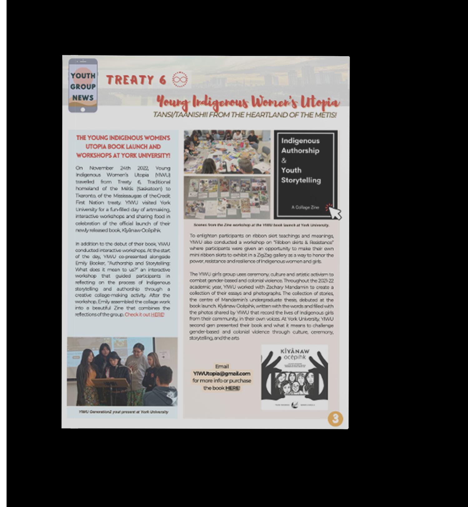 C’est à Saskatoon, sur les terres visées par le Traité no 6, qui forment le territoire métis traditionnel, qu’est né le groupe de filles Young Indigenous Women’s Utopia (YIWU). Ce groupe a été créé en réponse à la violence coloniale et sexiste que les filles et jeunes femmes autochtones subissent au quotidien dans les quartiers défavorisés de Saskatoon. La prière et la cérémonie occupent une place centrale dans les rassemblements de YIWU, où les jeunes s’encouragent mutuellement et puisent de la force dans les traditions nehiwayan et michif. Ces jeunes femmes apprennent à cultiver l’amour de soi comme forme de résistance primordiale, par des activités comme la réalisation de cellphilms, l’écriture, la danse et la création de fresques murales. Le groupe YIWU a publié deux livres qu’il a autoédités, lesquels ont connu une vaste diffusion. Ses membres ont d’ailleurs énormément voyagé pour donner des présentations, prendre la parole à des congrès et rencontrer d’autres groupes de jeunes en Amérique du Nord. En 2020, YIWU a gagné le prix d’Indspire Montrer la voie : Prix en éducation autochtone.