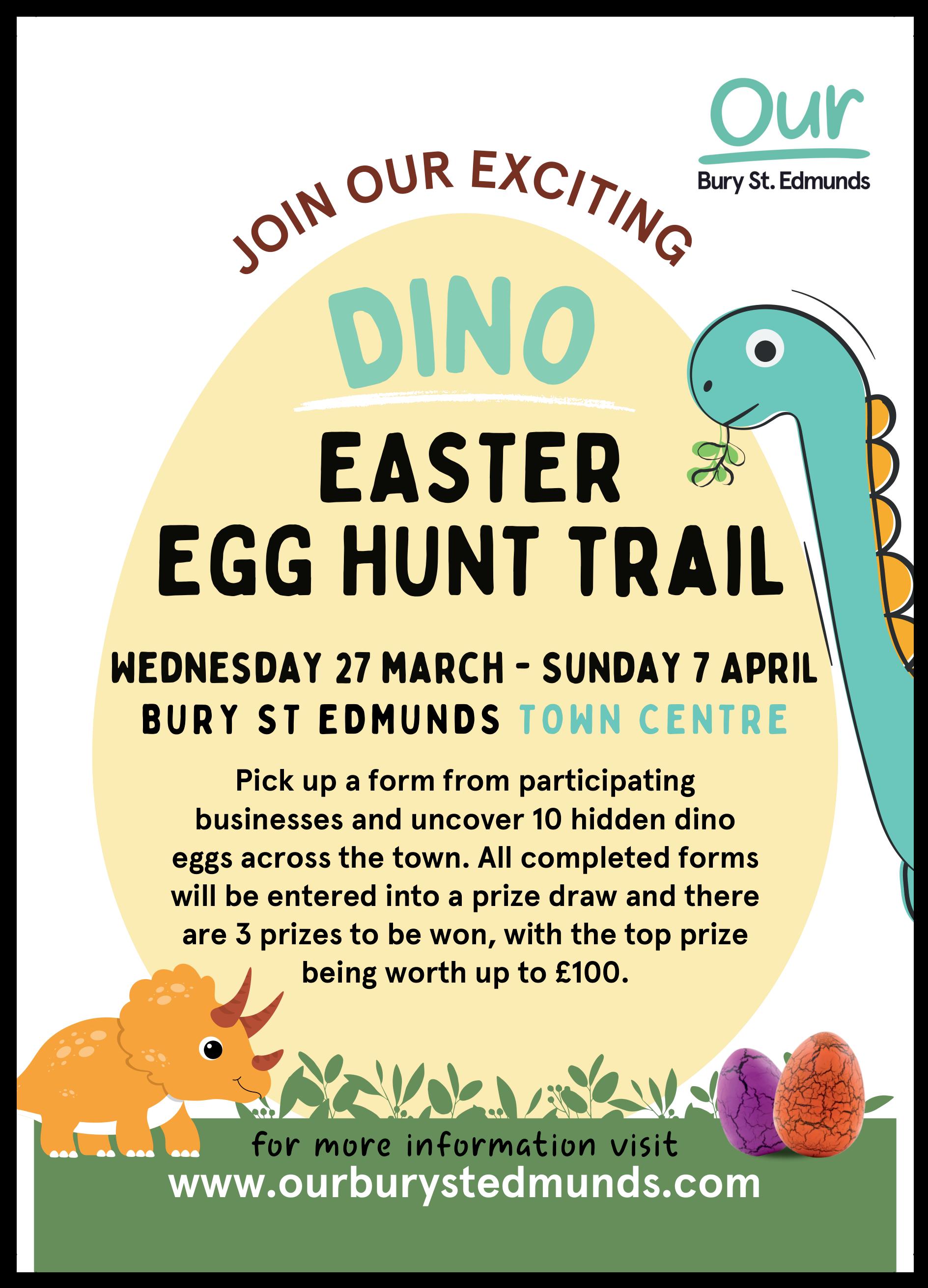 Although Easter has been and gone, there’s still some Easter fun to be had. A Dino Easter Egg Hunt Trail is being held in Bury St Edmunds town centre. It’s on until Sunday 7th April, and there’s a top prize worth up to £100 up for grabs! Find out more on page 12.