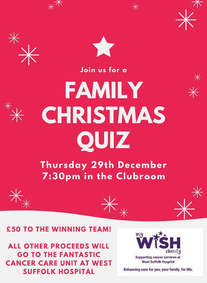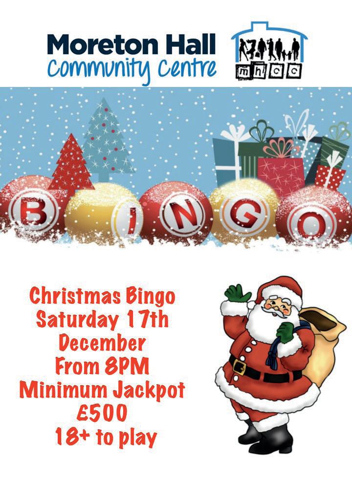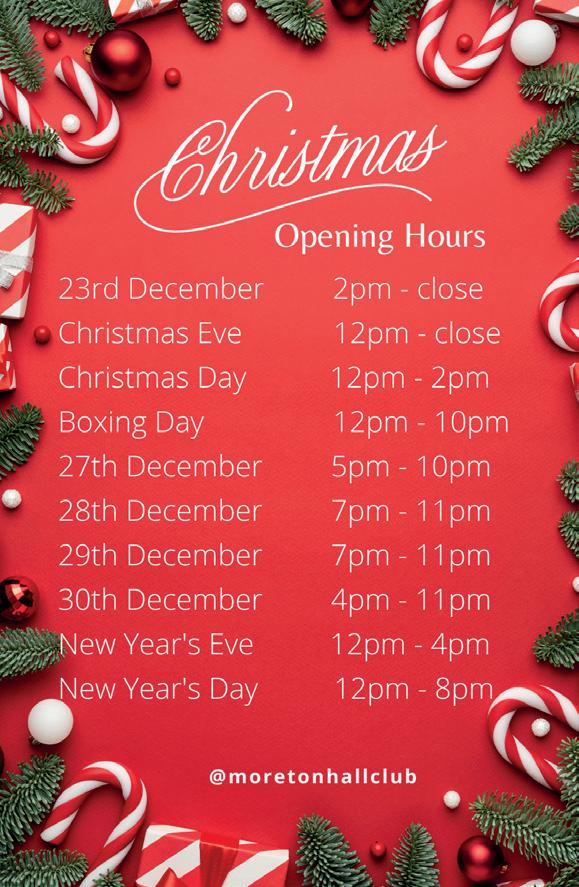 HALL FOR HIRE • Children’s Parties • Wedding Receptions • Private Functions • Bar & Staff included • AMPLE FREE PARKING • Conference Facilities also available Follow us on socials @moretonhallclub for all the latest news & what’s on! Tel: 01284 763402 www.moretonhallcommunitycentre.co.uk Email: info@moretonhallcommunitycentre.co.uk Moreton Hall BOOK NOW FOR YOUR EVENT! Community Centre OPENING HOURS MON: 7pm – 11pm TUES: 7pm – 11pm WEDS: 7pm – 11pm THURS: 7pm – 11pm FRI: 4pm – 11pm SAT: 12 midday – 11pm SUN: 12 midday – 8pm See below for Xmas hours We have a bumper end to the year following on from the World Cup, join as a member and hear about our events first! Just call into the bar during opening hours and sign up.
