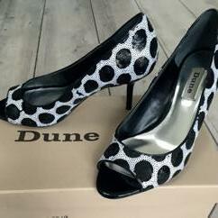 Ladies Size 5 Dune sequin black/white spot peeptoe shoe, unmarked heels & no rips, marks or sequins missing. All wrapped & boxed, heel height 7cm (3 inch). Matching handbag, again no marks, rips or missing sequins. Length 29cm (11.5 inch) and width 11cm (4.5 cm) Worn twice. £15 (cash on collection only)