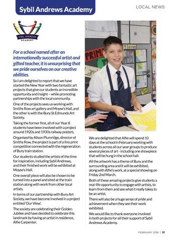 We are delighted that Alfie will spend 10 days at the school in February working with students across all our year groups to produce several pieces of art - including one showpiece that will be hung in the school hall. All the artwork has a theme of Bury and the surrounding area and it will be exhibited, along with Alfie’s work, at a special showing on Friday 2nd March. Both of these amazing projects give students a real-life opportunity to engage with artists, to learn from them and see what it really takes to be an artist. There will also be a huge sense of pride and achievement when they see their work exhibited. We would like to thank everyone involved in both projects for all their support of Sybil Andrews Academy. FEBRUARY 2018 | 17