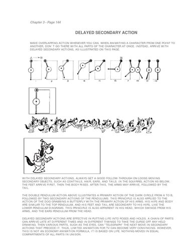 DELAYED SECONDARY ACTION MAKE OVERLAPPING ACTION WHENEVER YOU CAN. WHEN ANIMATING A CHARACTER FROM ONE POINT TO ANOTHER, DON´T GO THERE WITH ALL PARTS OF THE CHARACTER AT ONCE. INSTEAD, ARRIVE WITH DELAYED SECONDARY ACTIONS, AS ILLUSTRATED ON THIS PAGE.