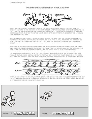 COMPARE THE ACTION OF THE WALK WITH THE RUN. IN THE WALK THE ARMS AND LEGS ARE STRETCHED OUT THE FARTHEST IN THE CONTACT DRAWING, HOWEVER, IN THE RUN THE STRETCH COMES WHEN THE FIGURE IS IN MIDAIR AT THE HIGH POINT OF THE ACTION.