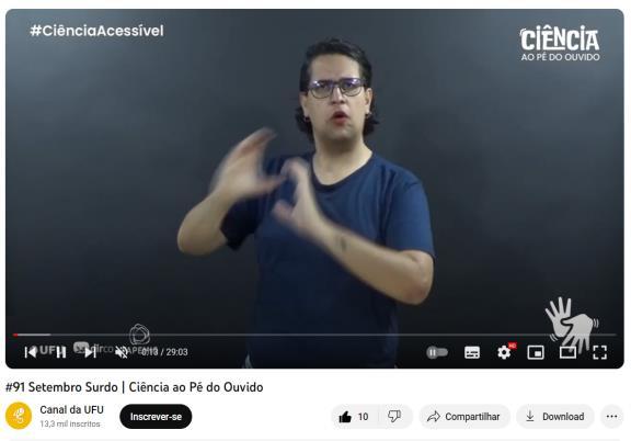 Tradução e intepretação para Libras, de comunicação e divulgação científica junto a Diretoria de Comunicação Social – DIRCO, do podcast “Ciência ao Pé do Ouvido” e demais informações nas redes sociais oficiais da Universidade Federal de Uberlândia – UFU.