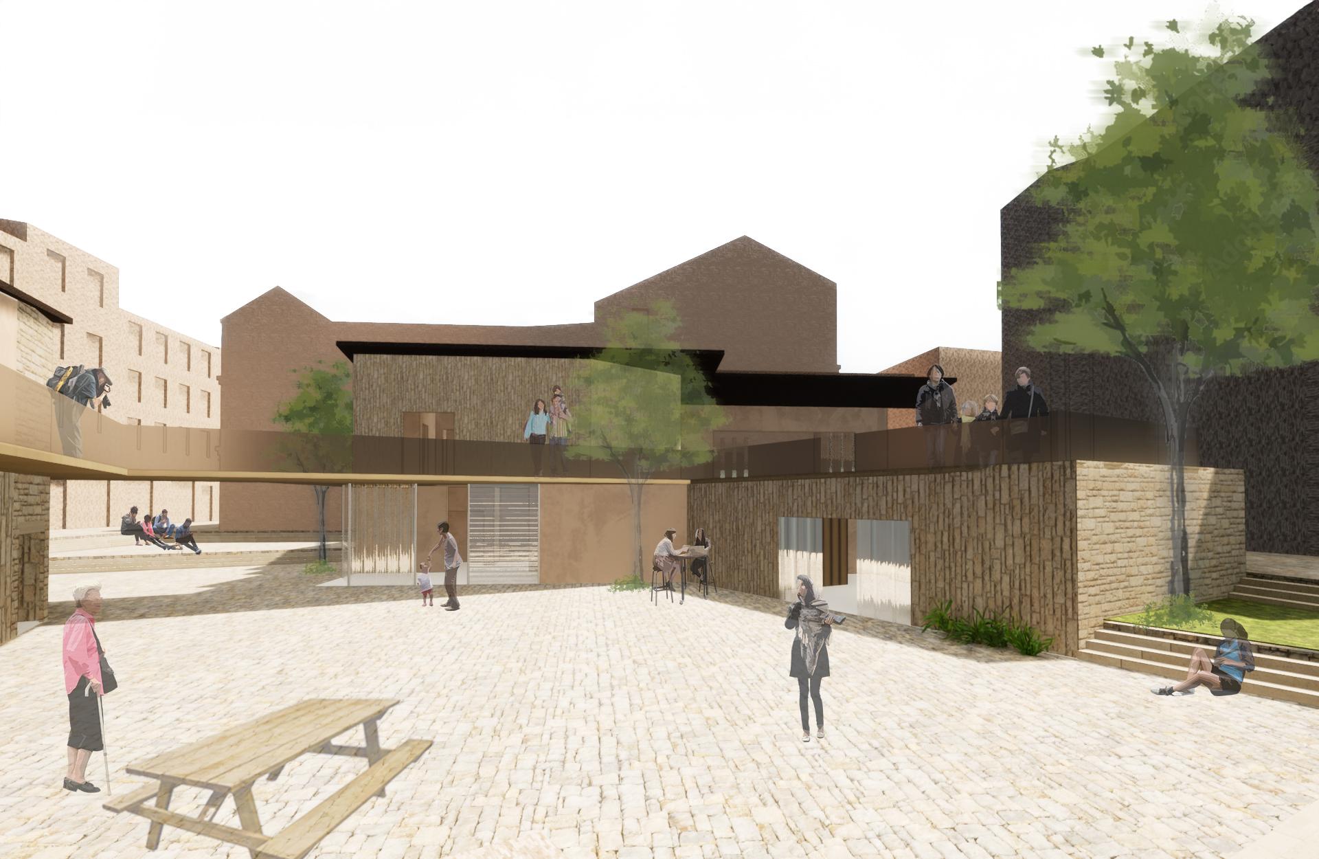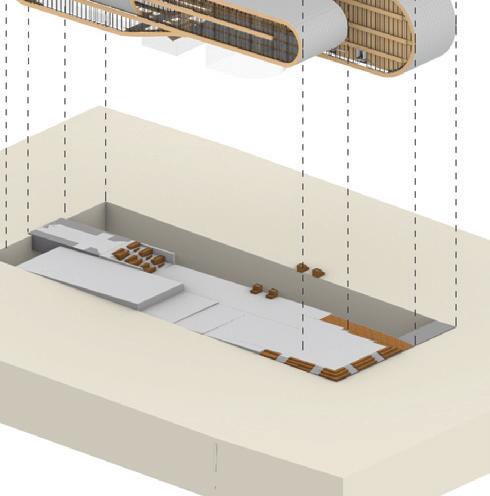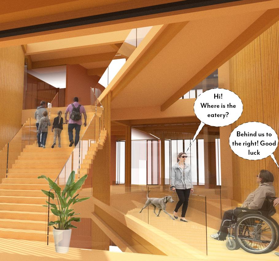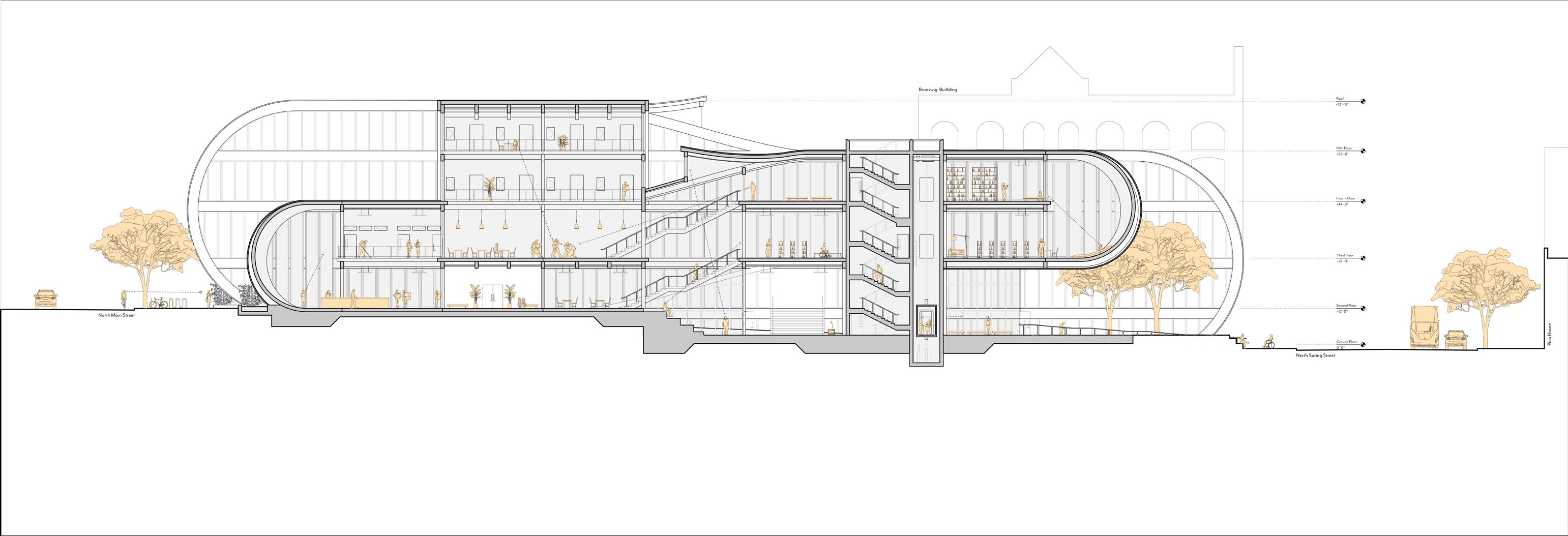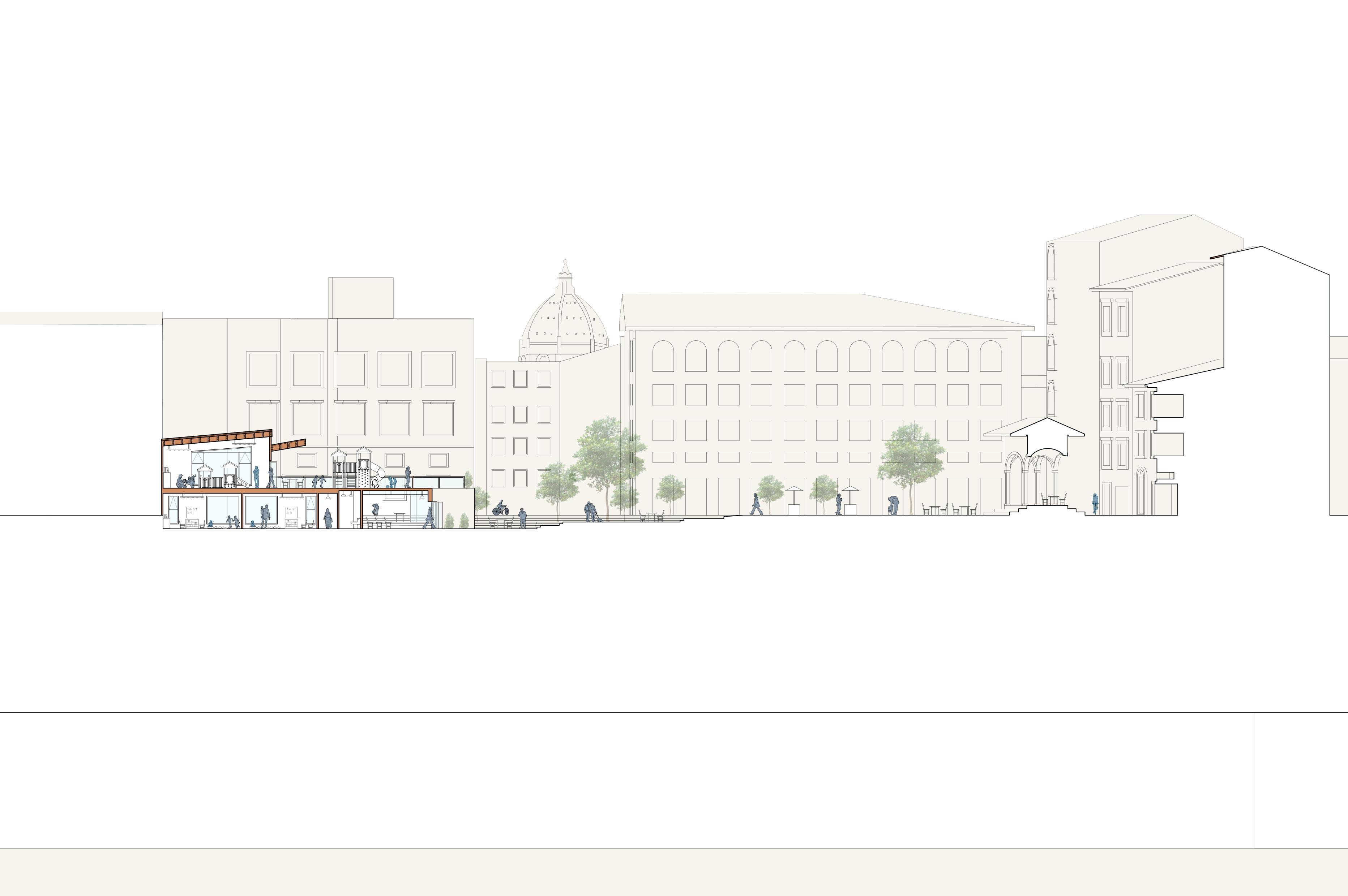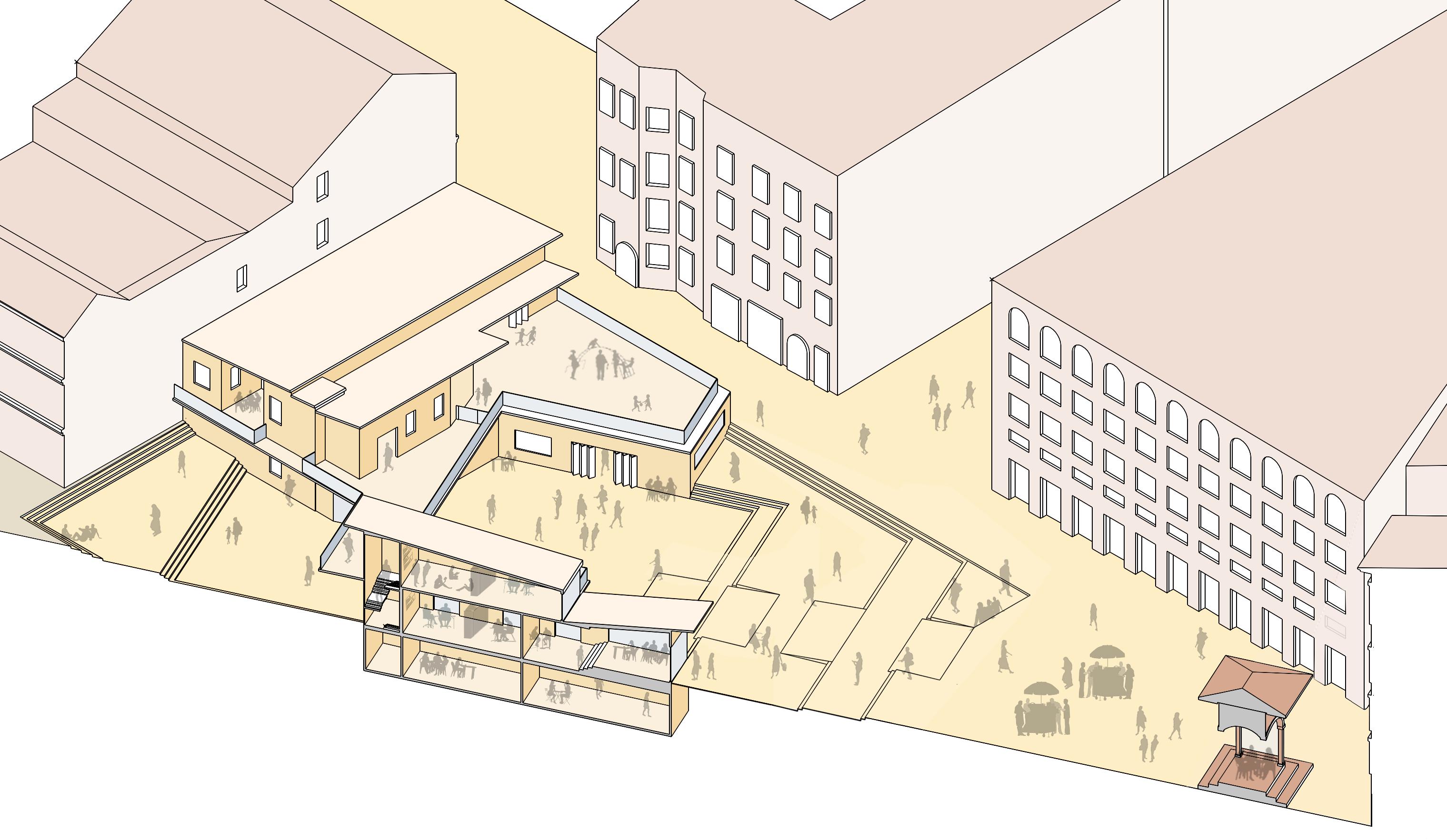 Through-site circulation has a gradual yet important slope which brings people down the main circulator ramp. This connects the existing piazza with the lowered piazza, directly linking the programs of that level. It also helps the lowered piazza be accessibility-friendly as a common experience for all. The sunken piazza creates zones of usable public space that helps draw people through and provide opportunity to dwell in the whole site. This enables all visitors to become users at any level of interaction. Further, this new form blends with the existing building conditions by stepping down as it connects into the landscape. While public and private spaces still have their separate functions, the focus of this project is to create a shared space between them which bridges all user experiences.