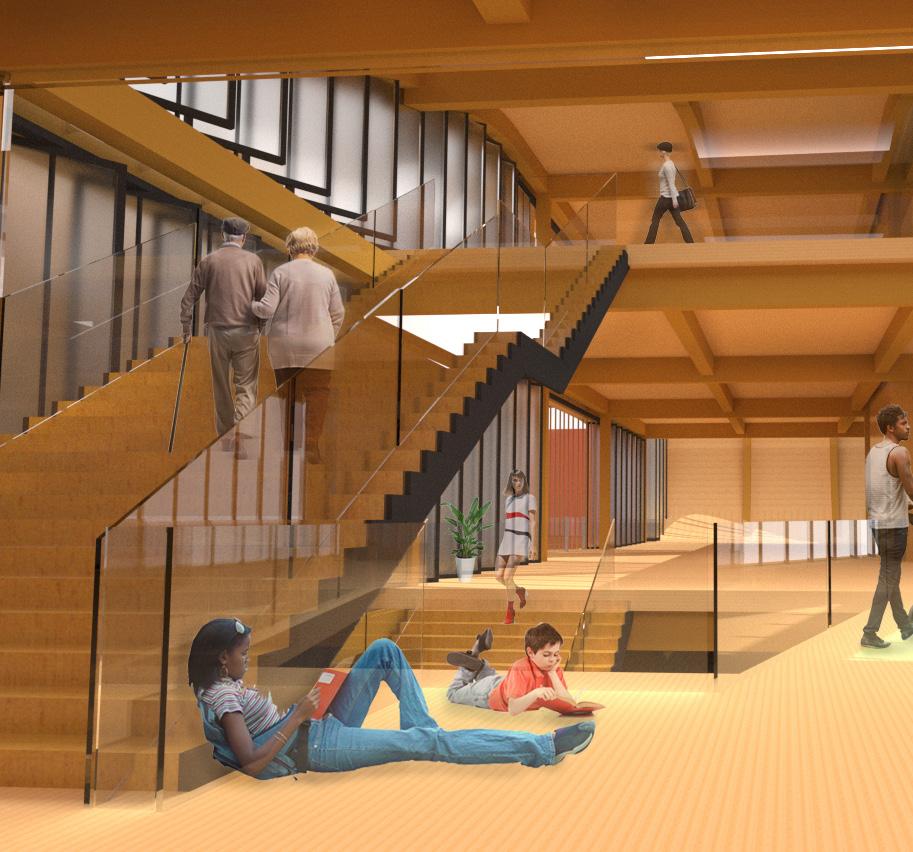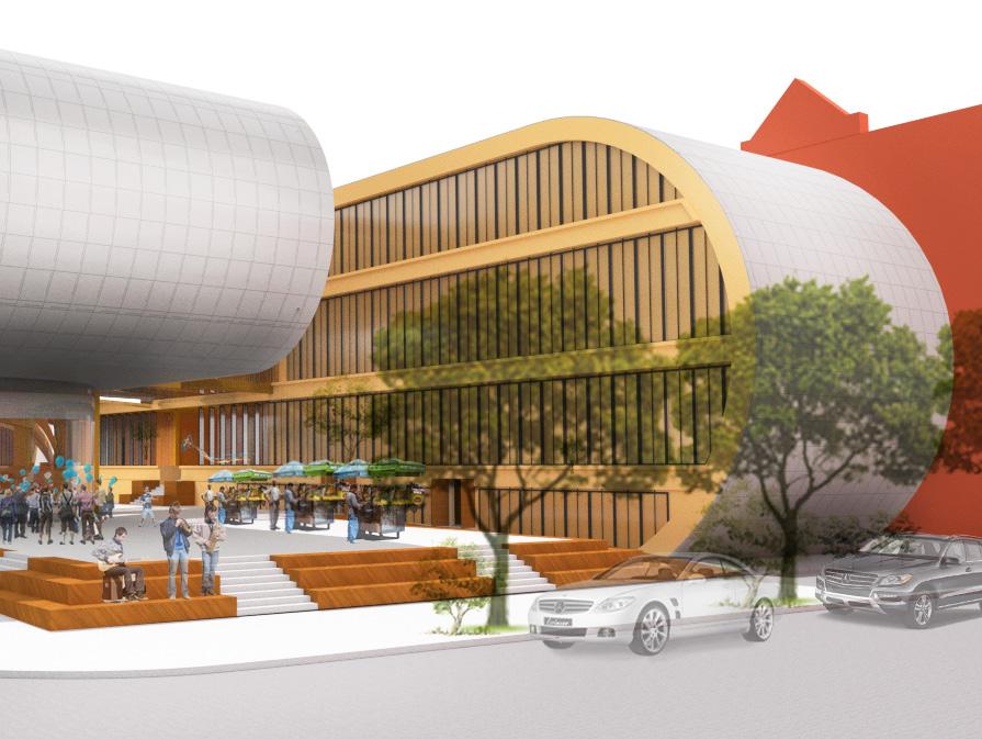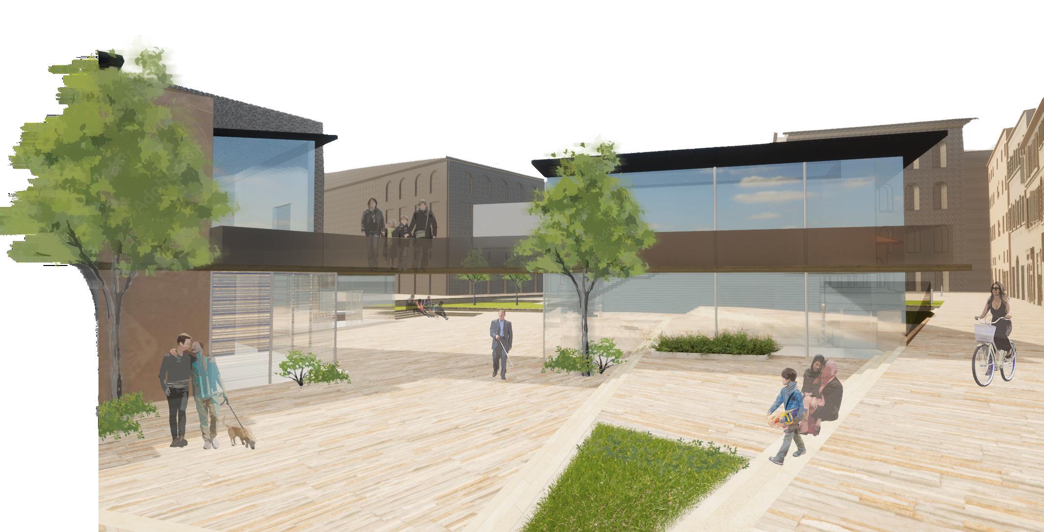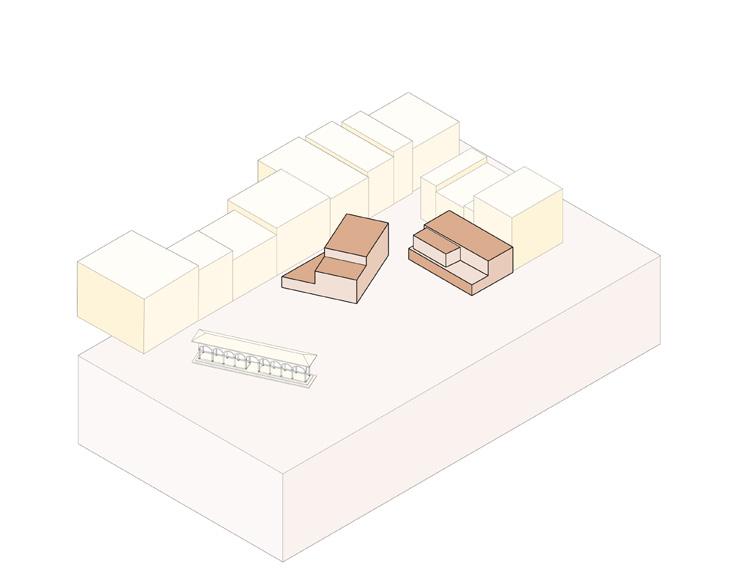 This project is the interaction point, the threshold of spaces. “Bridged” develops an underutilized piazza into a unified space to be adaptable for all. Every program on site has the possibility to blend into the piazza for its extended use, therefore inticing multiple programs to connect and create a network of shared experiences. This link continues on the upper floor through the deck as a form of common circulation and visual connection to the shared piazza and site landmarks. Additonally, the sunken piazza creates zones of usable public space that helps draw people through and provide opportunity to dwell in the whole site. This enables all visitors to become users at any level of interaction. Further, this new form blends with the existing building conditions by stepping down as it connects into the landscape. While public and private spaces still have their separate functions, the focus of this project is to create a shared space between them which bridges all user experiences.