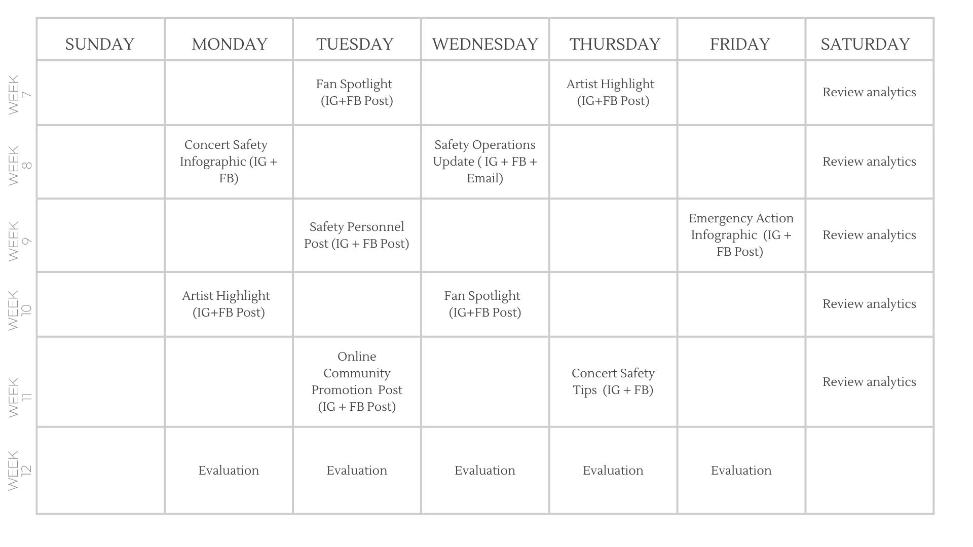 Several metrics can be used to evaluate the campaign's success. Social media analytics can be used to measure the success of increasing digital awareness. The number of posts regarding safety will reflect an increase, as well as metrics (clicks/likes/comments) on these posts. Social media analytics can also be used to measure the increase in positive perception with Live Nation by evaluating social media traffic and online conversation Furthermore, measuring the metrics of online communities, such as interaction numbers and member amounts, will reflect in creating trust and community with their audience.