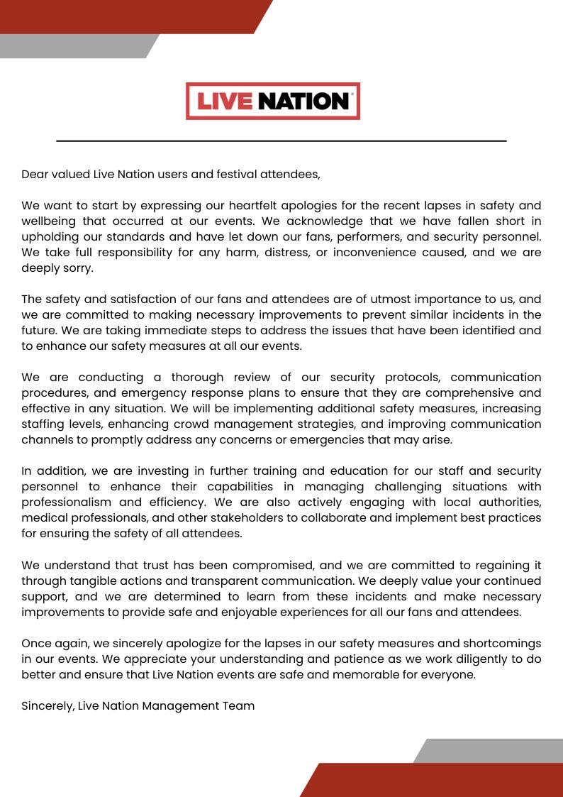IN ADDITION, SEVERAL CONCERTGOERS DOCUMENTED THE INCIDENT ON SOCIAL MEDIA, POSTING VIDEOS AND RECOUNTING THEIR EXPERIENCES, WHICH LED TO WORLDWIDE SCRUTINY FOR BOTH LIVE NATION AND SCOTT. AFTER THE TRAGEDY BROKE THE NEWS, THERE WAS A SIGNIFICANT BACKLASH TOWARDS LIVE NATION DUE TO THEIR LACK OF PREPARATION FOR CROWD CONTROL, RESULTING IN THE CROWD SURGING. ON TOP OF THIS, HERE WAS ALSO A LACK OF HELP FROM THE SECURITY TEAM TO HELP THOSE PUSHED TO THE GROUND, ALONG WITH A POOR OVERALL EMPHASIS ON INDIVIDUAL AND GROUP SAFETY.
