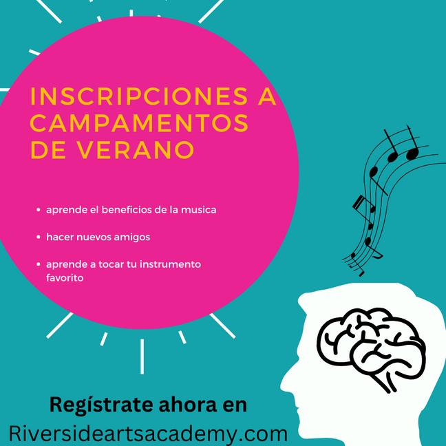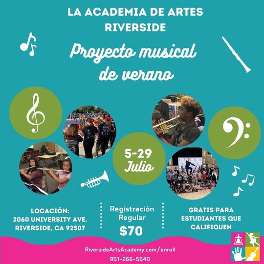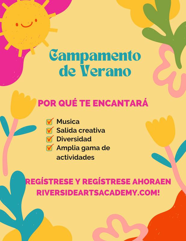 FlyersinSpanishwillbecreatedtospreadawarenessaboutRiverside ArtsAcademy.Threedifferentflyers,oneofwhichwillbeaboutregistration informationandanotherdedicatedtotheSummermusicprogram.These flyerswillbemadetopostaroundHispanicgrocerystoresandotherareas withahighSpanish-speakingpopulation.Whiletheintentionoftheseflyersis tobeinphysicalpaperformat,digitalflyerswillbeavailabletosendoutwith PeachjarthroughtheRiversideUnifiedSchoolDistrict.