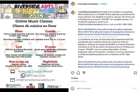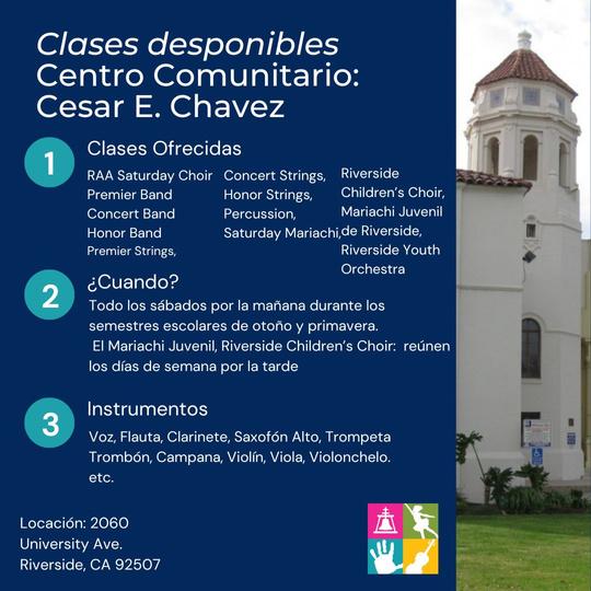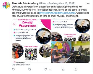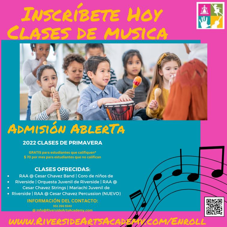 RAAmakesaconcertedefforttohelpchildrensucceedfromkindergarten throughhighschoolgraduationandaimstocreateanetworkofreceptive familiesandcollaborativecommunityrelationshipstoadvancetheRAAMission. TheRiversideArtsAcademyoffersafterschoolmusicinstructionatschoolsinthe RiversideUnifiedSchoolDistrictandAlvordUnifiedSchoolDistrict.RAAalso providesSaturdayandafterschoolmusicinstructionattheCesarChavez CommunityCenter.AspartofRAA’spartnershipwiththeRiversideUnifiedSchool District,RUSDcoversthetuitionfortheirstudentsinselectprograms.Students whoreceiveascholarshiphaveaccesstofreemusicinstructionandmusical instruments.