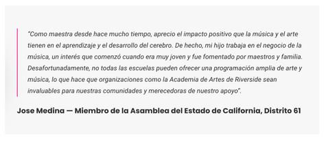 InfluentialcommunityleadersfromavarietyofsectorsmakeupRAA's communityboard,whichactivelyandsupportivelyinfluencestheprogram. TheseleaderscomefromtheAlvordUnifiedSchoolDistrict,CaliforniaBaptist University,CaliforniaUniversityofSanBernardino,theCityofRiverside,LaSierra University,LatinoNetwork,RiversideCityCollege,RiversideFireDepartment, RiversideParksandRecreation,RiversidePoliceDepartment,andRiverside UnifiedSchoolDistrict,amongothers(RiversideArtsAcademy,2023).The organizationhasvariousinstructorsincludingMaestroGeneMoonwho,asof fall2018,hasheldthepositionofMusicDirector.