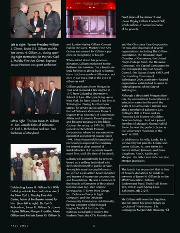 and the Christiana Care Corporation. He was also Chairman of several organizations, including The Gilliam Foundation, the Delaware State Chamber of Commerce, the United Negro College Fund, the Delaware Campaign, the Capital Campaigns for the Chesapeake Bay Girl Scouts Council, the Walnut Street YMCA and the founding Chairman of Wilmington 2000, a privately funded organization established to assist in redevelopment of the City of Wilmington. Although a dedicated Morgan alumnus, his commitment to excellence in education extended beyond the walls of his alma mater. Gilliam was also a member of Baltimore City College’s Hall of Fame and an Honorary Life Trustee of GoldeyBeacom College. And, as a proud member of Morgan’s Alumni Hall of Fame, he was the perfect choice as the university’s "Alumnus of the Year" in 2002. In addition to his wife, Linda, he is survived by his parents, Louise and James Gilliam, Sr., one sister, Dr. Patrice Gilliam Johnson, and three daughters, Alexis, Leslie and Morgan. His father and sister are also Morgan graduates. The family has requested that in lieu of flowers, donations be made in memory of James H. Gilliam Jr. to the MSU Foundation, Gilliam Endowment Fund, Truth Hall, Room 201, 1700 E. Cold Spring Lane, Baltimore, MD 21251. Mr. Gilliam will never be forgotten, and we salute his proud legacy as co-chair of "New Horizons: The Campaign for Morgan State University."