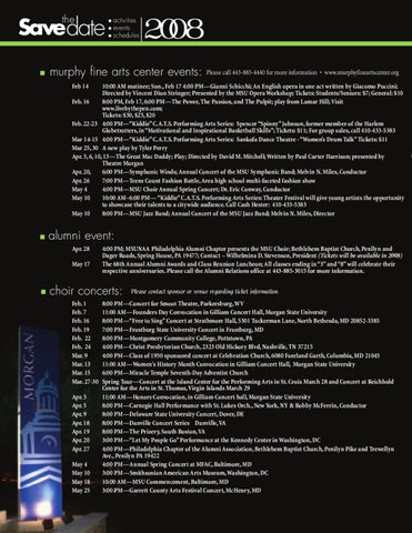 10:00 AM matinee; Sun., Feb 17 4:00 PM—Gianni Schicchi; An English opera in one act written by Giacomo Puccini; Directed by Vincent Dion Stringer; Presented by the MSU Opera Workshop; Tickets: Students/Seniors: $7; General: $10 Feb. 16 8:00 PM, Feb 17, 6:00 PM—The Power, The Passion, and The Pulpit; play from Lamar Hill; Visit www.livebythepen.com; Tickets: $30, $25, $20 Feb. 22-23 4:00 PM—“Kiddie” C.A.T.S. Performing Arts Series: Spencer “Spinny” Johnson, former member of the Harlem Globetrotters, in “Motivational and Inspirational Basketball Skills”; Tickets: $11; For group sales, call 410-433-5383 Mar 14-15 4:00 PM—“Kiddie” C.A.T.S. Performing Arts Series: Sankofa Dance Theatre - “Women’s Drum Talk” Tickets: $11 Mar 25, 30 A new play by Tyler Perry Apr. 3, 6, 10, 13—The Great Mac Daddy; Play; Directed by David M. Mitchell; Written by Paul Carter Harrison; presented by Theatre Morgan Apr. 20, 6:00 PM—Symphonic Winds; Annual Concert of the MSU Symphonic Band; Melvin N. Miles, Conductor Apr. 26 7:00 PM—Teens Count Fashion Battle, Area high school multi-faceted fashion show May 4 4:00 PM—MSU Choir Annual Spring Concert; Dr. Eric Conway, Conductor May 10 10:00 AM–6:00 PM— “Kiddie” C.A.T.S. Performing Arts Series: Theater Festival will give young artists the opportunity to showcase their talents to a citywide audience. Call Cash Hester: 410-433-5383 May 10 8:00 PM—MSU Jazz Band; Annual Concert of the MSU Jazz Band; Melvin N. Miles, Director