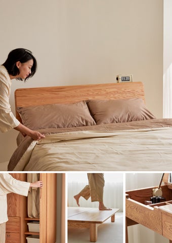 清潔與保養 相互了解,方能長久陪伴 木家具特性 森手家具平時不需特別保養,請放鬆自在的使 用:)家具表面可以微濕的抹布擦拭灰塵,沾到 油漬處亦可搭配中性清潔劑使用,盡可能保持 家具乾燥。若家具挑選使用森手 PU 漆裝,以 稀釋酒精或次氯酸水沾在乾淨棉布上消毒清潔 是沒問題的! * 勿使用菜瓜布刷洗家具表面 * 選擇彩色系列塗裝不可使用酒精 MORiii 照片提供:大城小室空間設計 提醒與叮嚀 實木家具會隨著環境光照、空氣中鹽分等產生氧 化現象,時間久後會使得顏色變深。 木頭會隨著季節溫度變化而熱漲冷縮,有時會產 生「嘎嘎」的聲響,是自然的正常現象,別被嚇 著囉!另外森手家具為「室內家具」,請避免置 於室外或浴室內。 • 橡木含單寧酸,遇水容易產生化學變化使表 面發黑,其現象並非發霉,不影響使用,建議 桌面使用後儘速擦拭乾淨保持乾燥。 • 木製品本身有調節溼氣的作用,但吸收過多