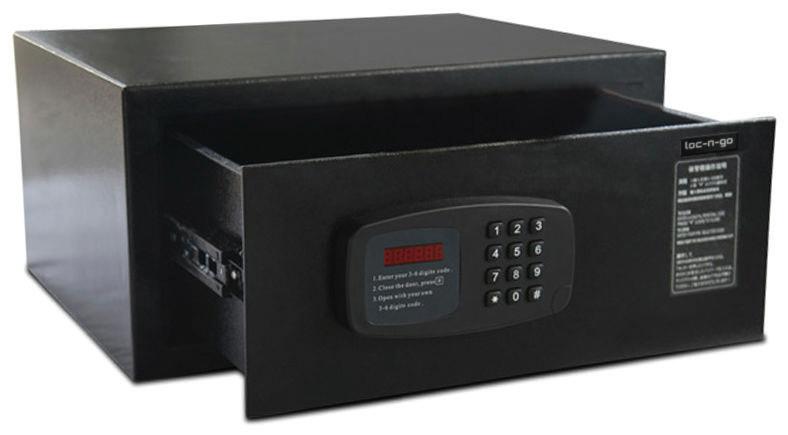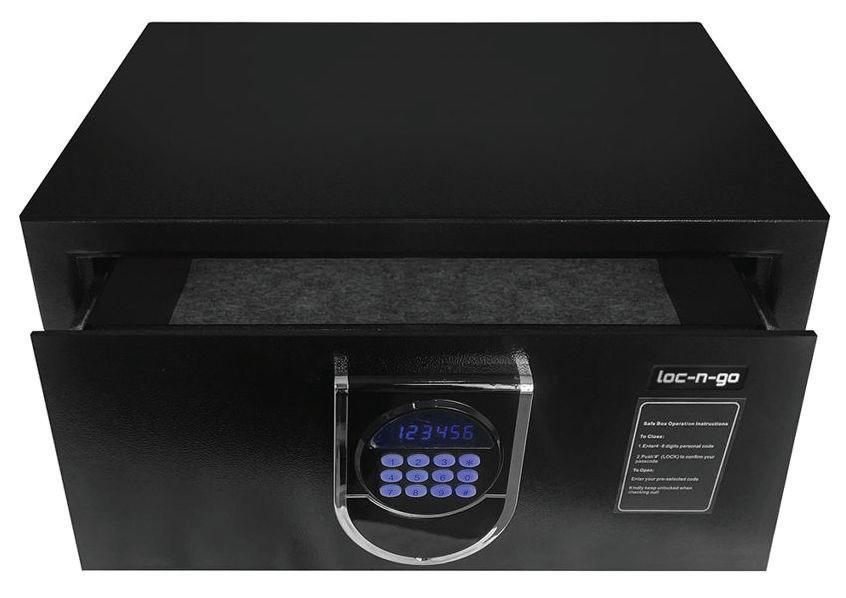 The loc-n-go Safe is designed for security and ease of use, featuring a 4–6-digit guest code, manager override, and LED display for simple operation. The interior accommodates valuables such as 15-17” laptops, providing peace of mind for guests. Built for durability and frequent use, the loc-n-Go Safe offers a dependable solution.