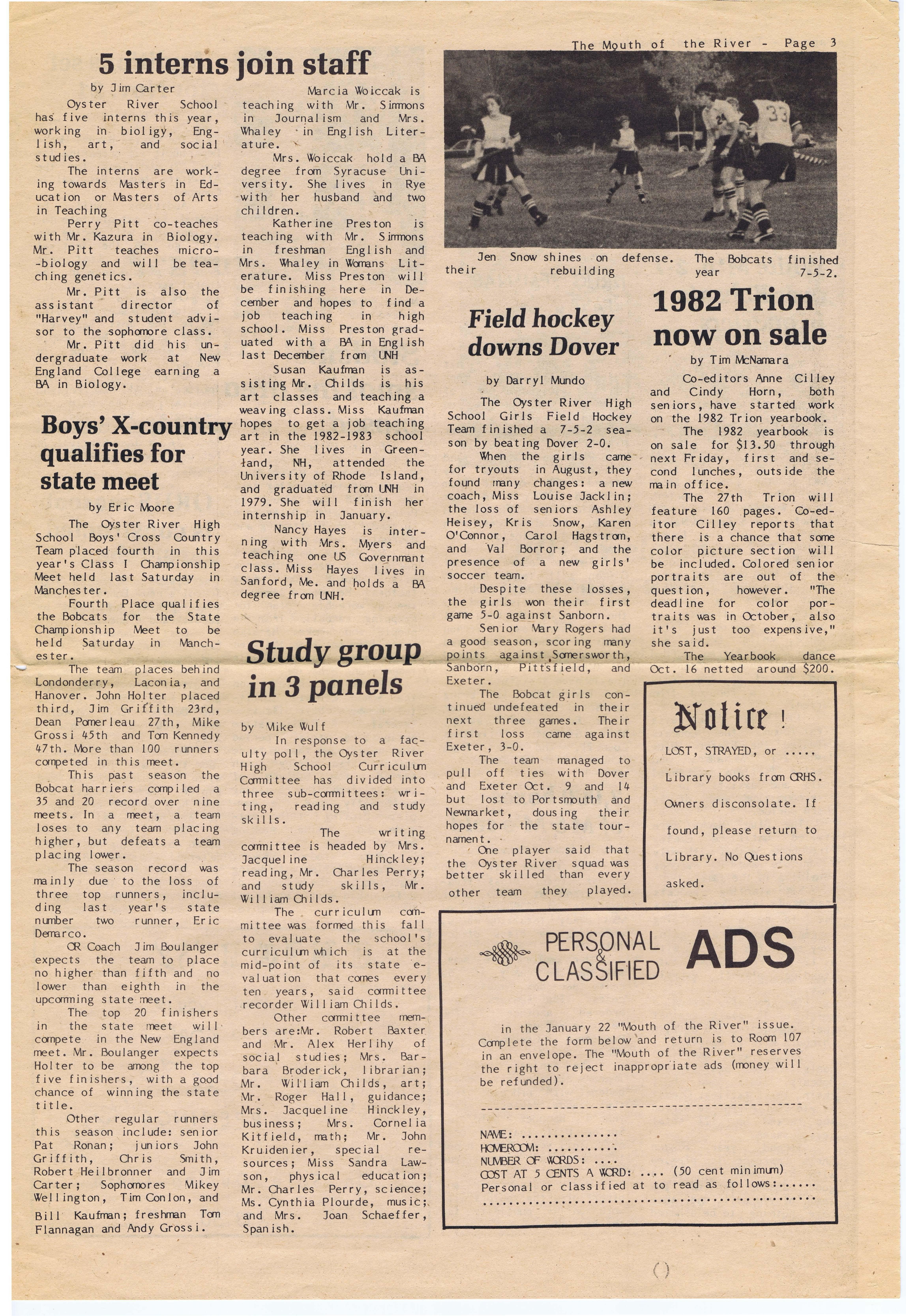 Oyster River School has five interns this year, working in bioligy, Engl i s h , a r t , and soc i a 1 1 studies.