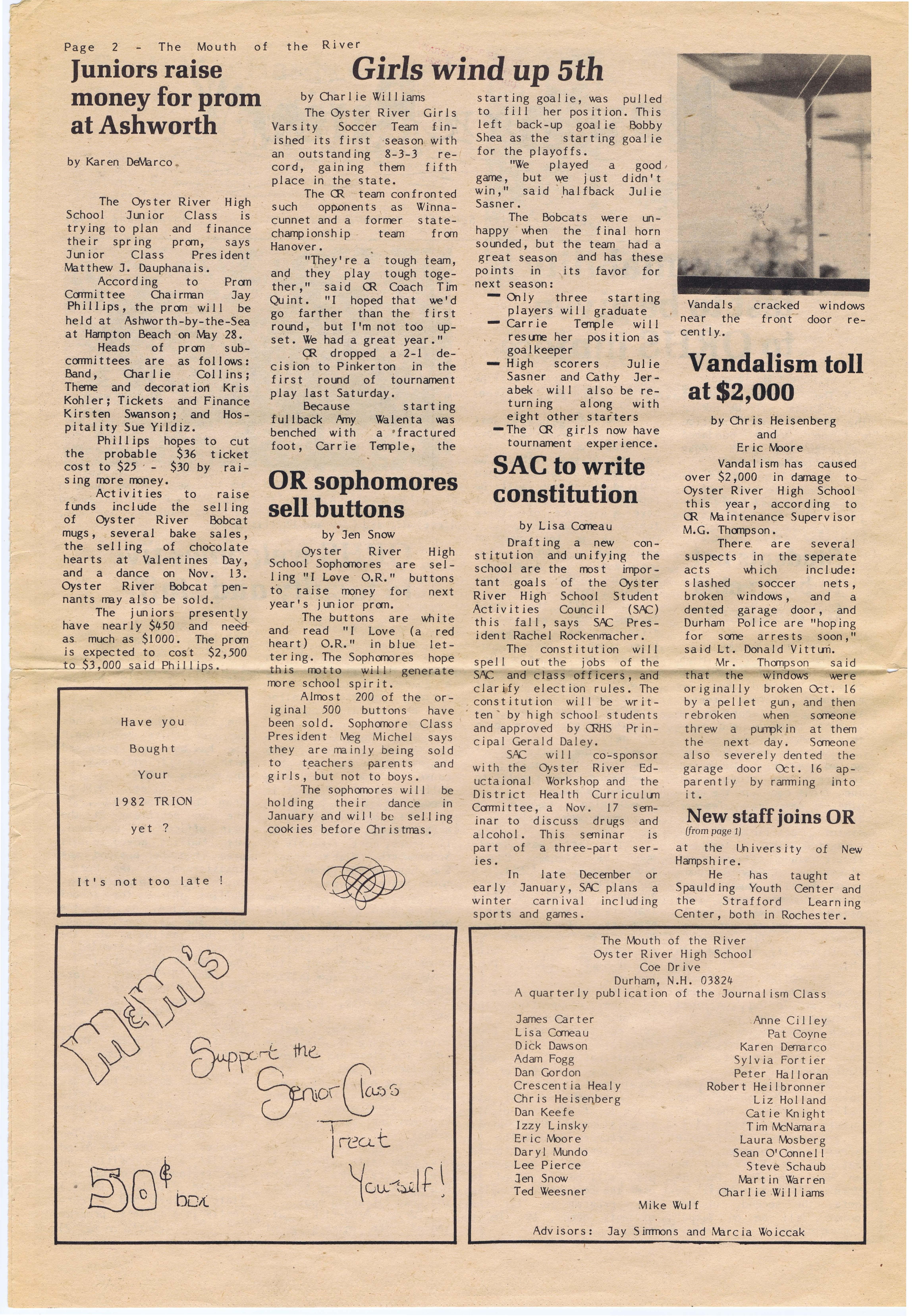 Vandal ism has caused over $2,000 in d&nage to Oyster River High School this year, according to CR Maintenance Supervisor M.G. Thcrnpson. There are several suspects in the seperate acts which include: slashed soccer nets, broken windows, and a dented garage door, and Durham Police are "hoping for sane arrests soon," said Lt. Donald Vittun.
