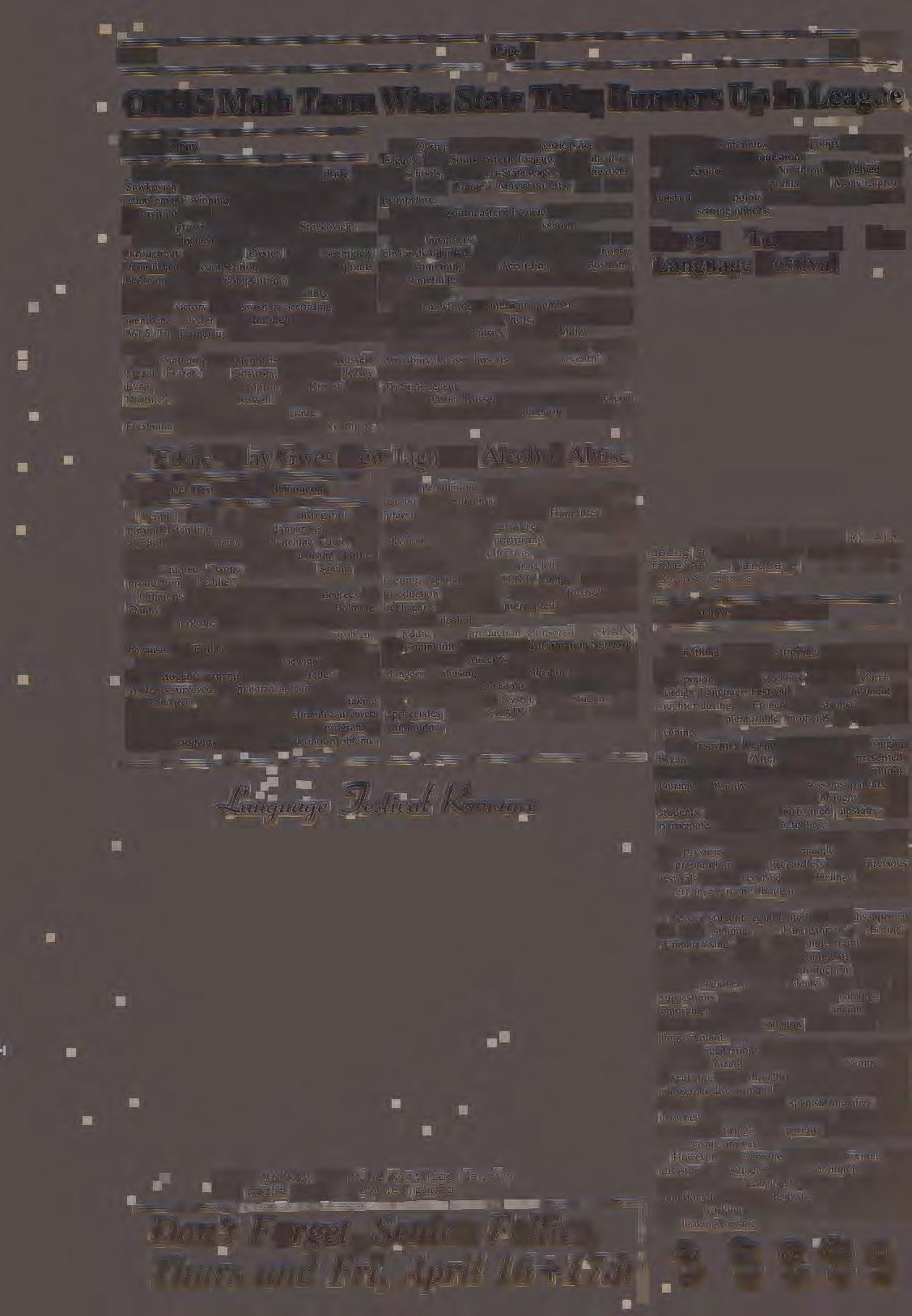With the highest score out of 52 other teams from throughout the state, Oyster River seemingly demolished the competition with a span of 22 points between us and the competition. The fact that we fell short of the state title by two points last year made the victory much sweeter, according to team me~bers. Oyster River finished with a score of 361.5 The runner-up was Exeter Area High with a score of 339.5.