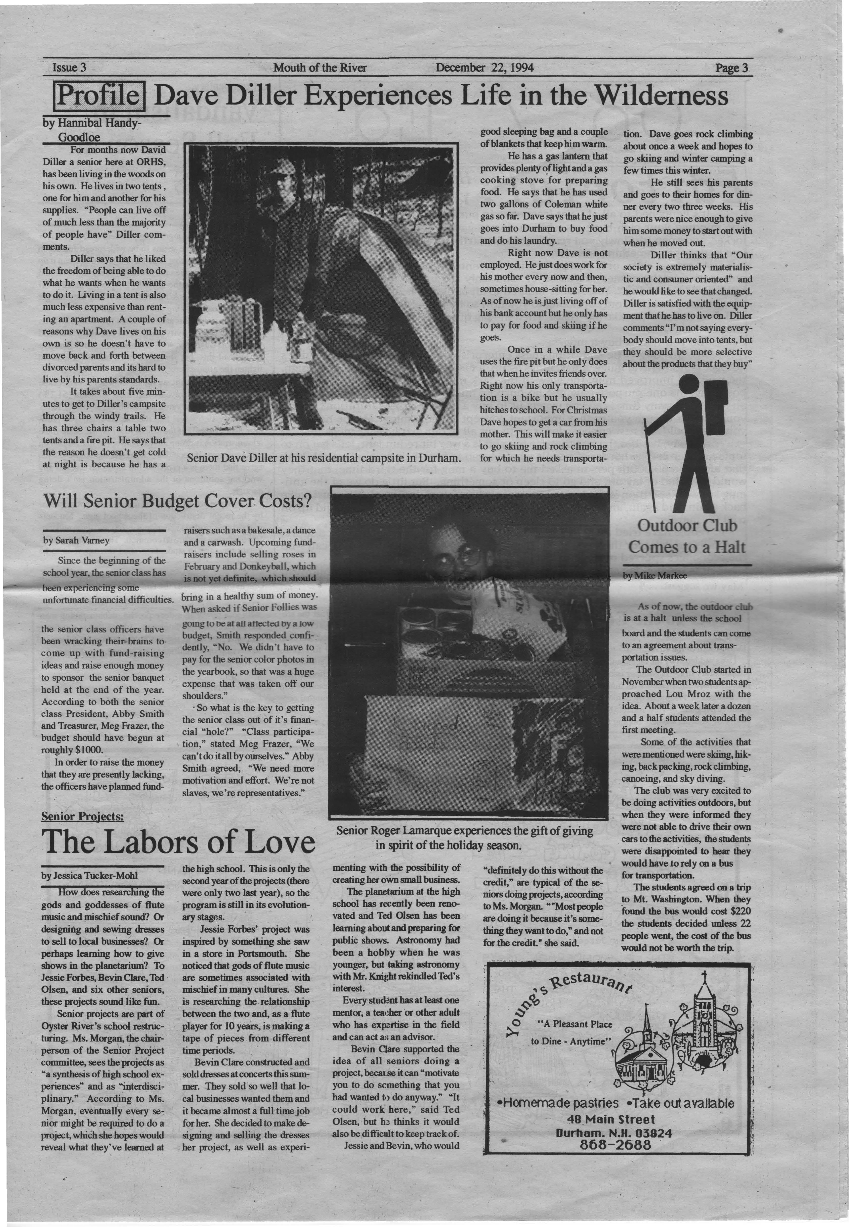 For months now David Diller a senior here at ORRS, has been living in the woods on his own. He lives in two tents, one for him and another for his supplies. "People can live off of much less than the majority of people have" Diller comments.
