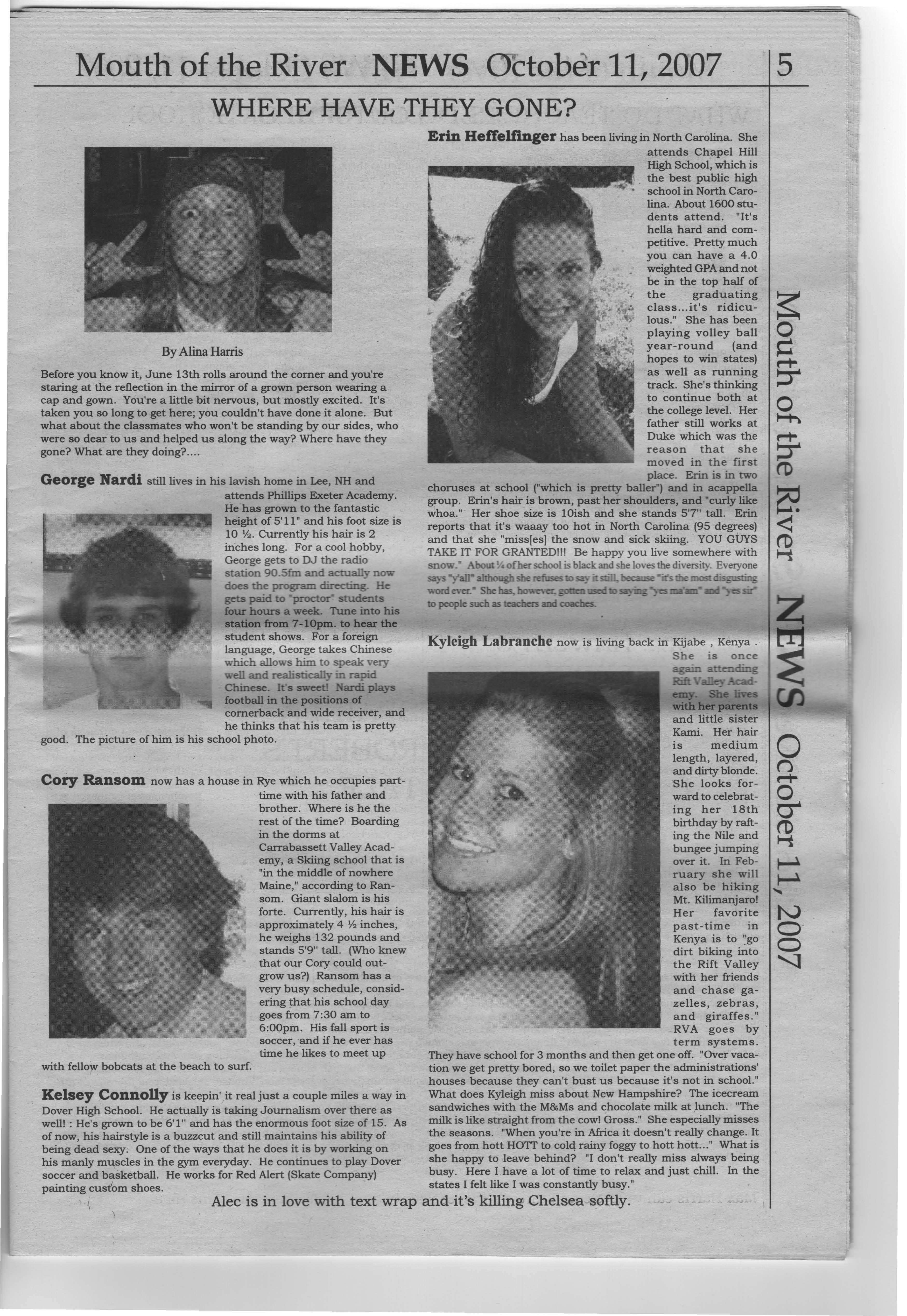 Erin Heffelfinger lias been living in North Carolina. She attends Chapel Hill High School, which is the best public high school in North Carolina. About 1600 students attend. "It's hella hard and competitive. Pretty much you can have a 4.0 weighted GPA and not be in the top half of the graduating class it's ridiculous." She has been playing volley ball year-round (and hopes to win states) as well as running track. She's thinking to continue both at the college level. Her father still works at Duke which was the reason that she moved in the first place. Erin is in two choruses at school ("which is pretty baller") and in acappella group. Erin's hair is brown, past her shoulders, and "curly like whoa." Her shoe size is 10ish and she stands 5'7" tall. Erin reports that it's waaay too hot in North Carolina (95 degrees) and that she "miss[es] the snow and sick skiing. YOU GUYS TAKE IT FOR GRANTEDI!! Be happy you live somewhere with snow. AI. ofher school is black and she loves the diversity. Everyone all although 'Old el er.. She bas, hm. to people such as teachers and coaches.