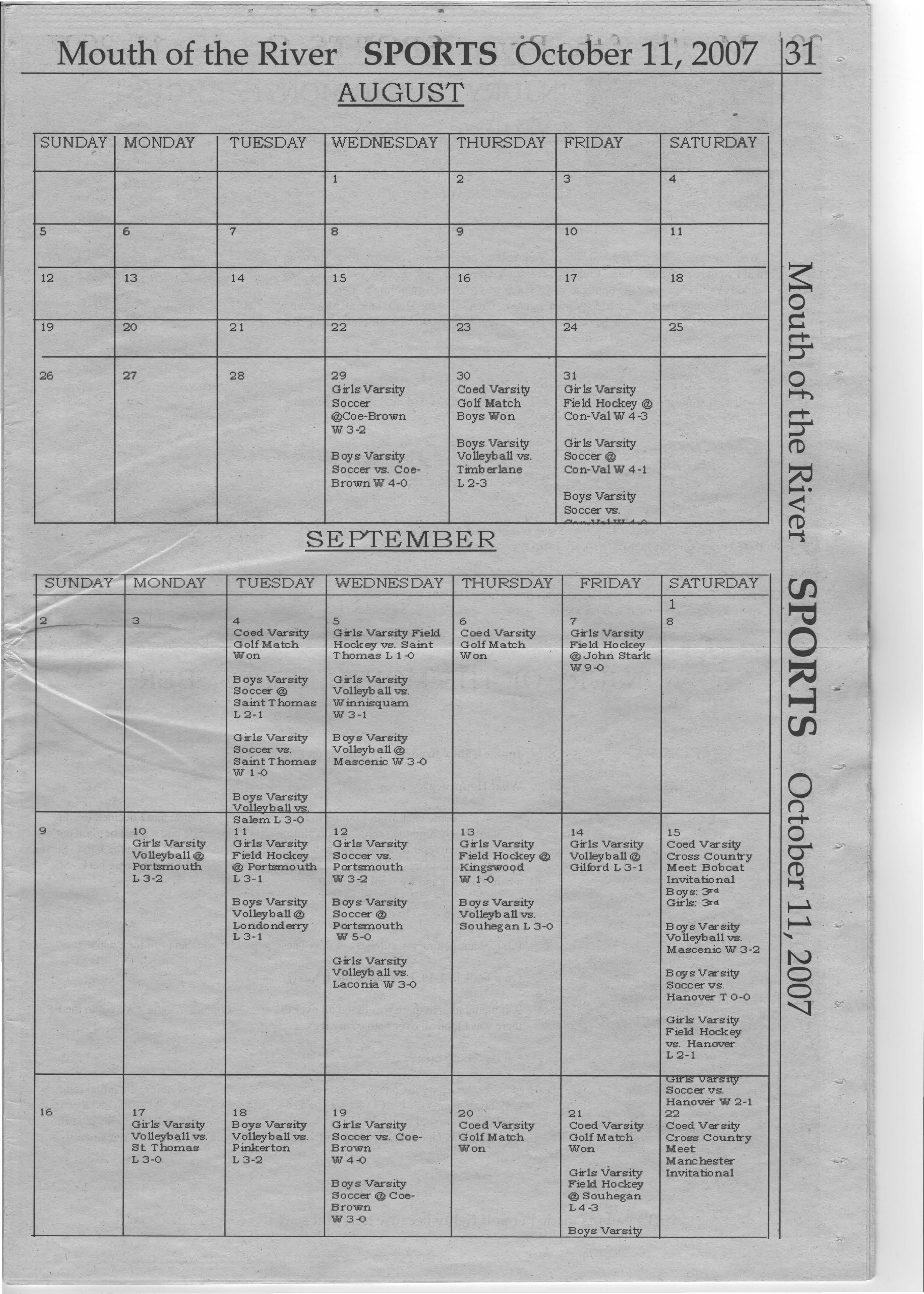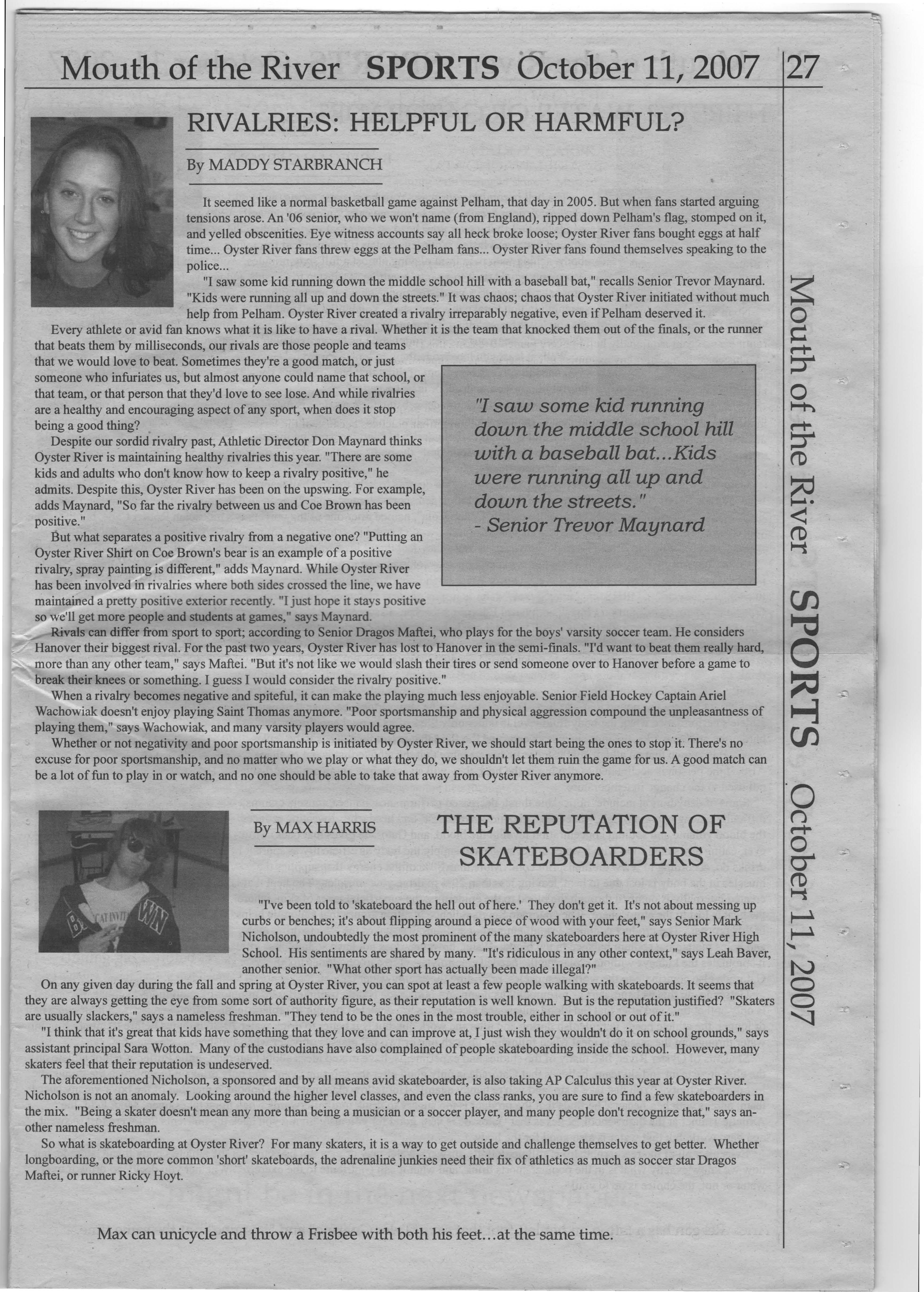 Despite our sordid rivalry past, Athletic Director Don Maynard thinks Oyster River is maintaining healthy rivalries this year. "There are some kids and adults who don't know how to keep a rivalry positive," he admits. Despite this, Oyster River has been on the upswing. For example, adds Maynard, "So far the rivalry between us and Coe Brown has been positive."