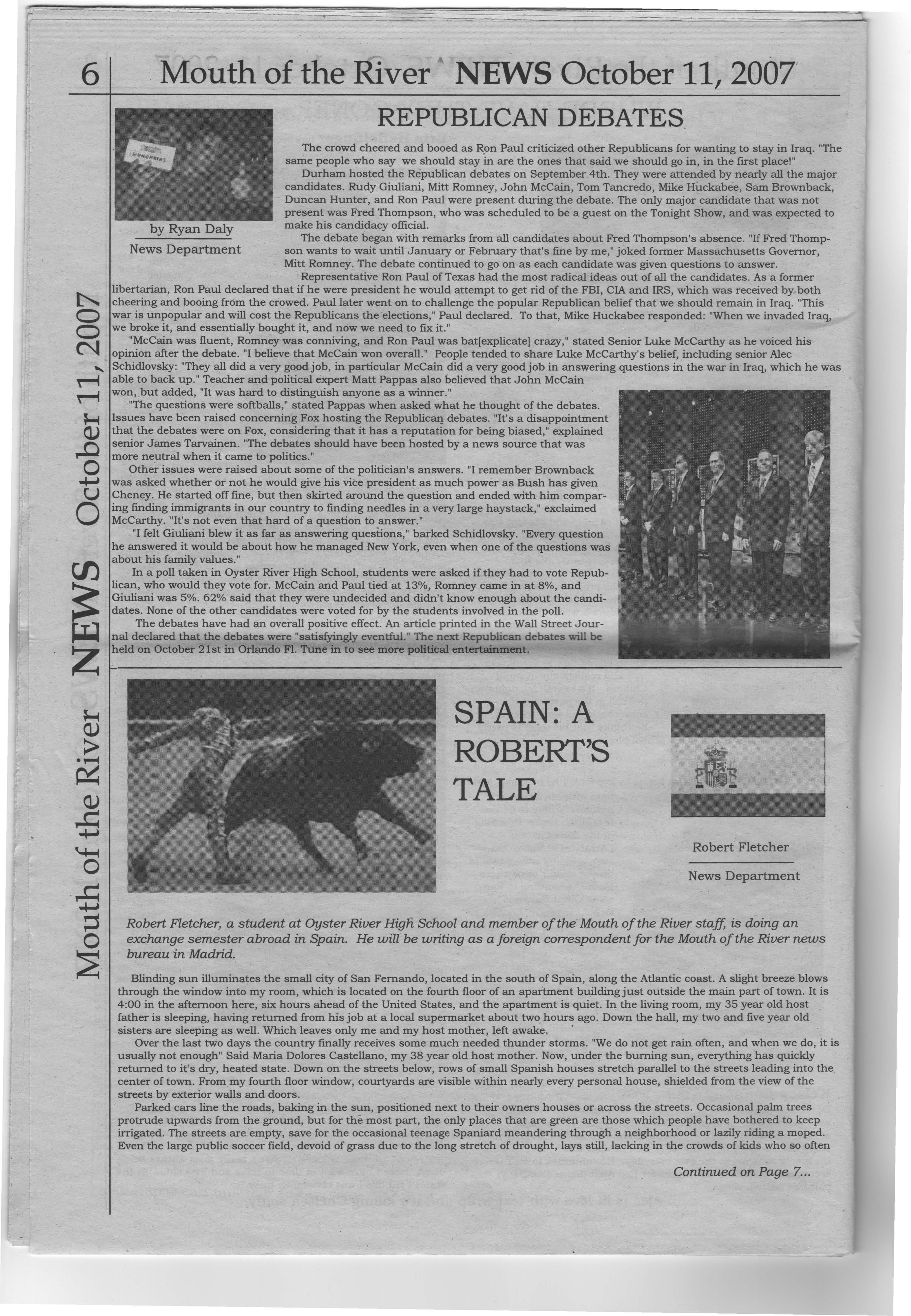 The debate began with remarks from all candidates about Fred Thompson's absence. "If Fred ThompNews Department son wants to wait until January or February that's flne by me," joked former Massachusetts Governor, Mitt Romney. The debate continued to go on as each candidate was given questions to answer, Representative Ron Paul of Texas had the most radical ideas out of all the candidates. As a former libertarian, Ron Paul declared that if he were president he would attempt to get rid of the FBI, CIA and IRS, which was received by both cheering and booing from the crowed. Paul later went on to challenge the popular Republican belief that we should remain in Iraq "This war is unpopular and will cost the Republicans the elections," Paul declared. To that, Mike Huckabee responded: "When we invaded Iraq, we broke it, and essentially bought it, and now we need to flx it."