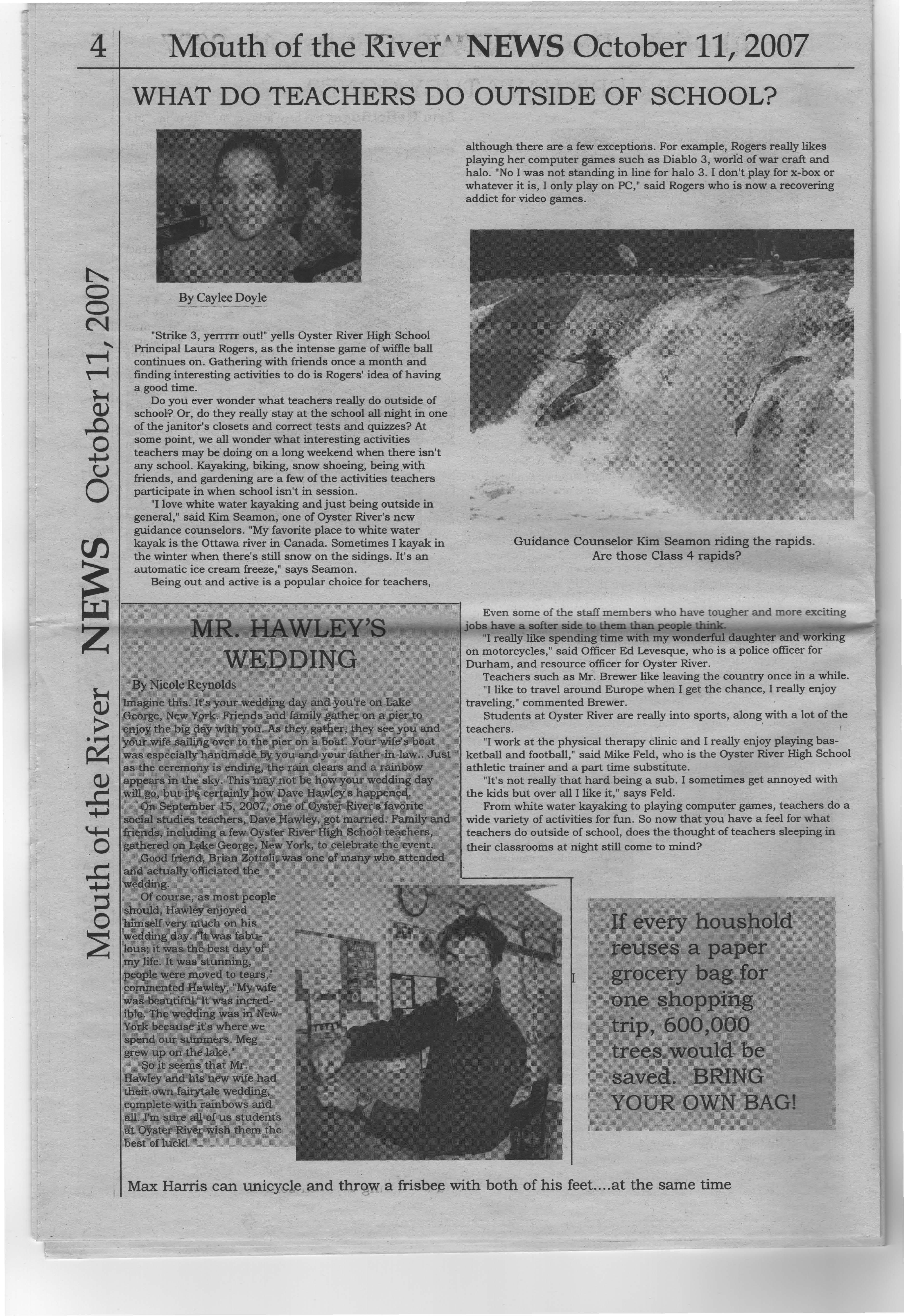 Do you ever wonder what teachers really do outside of school? Or, do they really stay at the school all night in one of the janitor's closets and correct tests and quizzes? At some point, we all wonder what interesting activities teachers may be doing on a long weekend when there isn't any school. Kayaking, biking, snow shoeing, being with friends, and gardening are a few of the activities teachers participate in when school isn't in session.