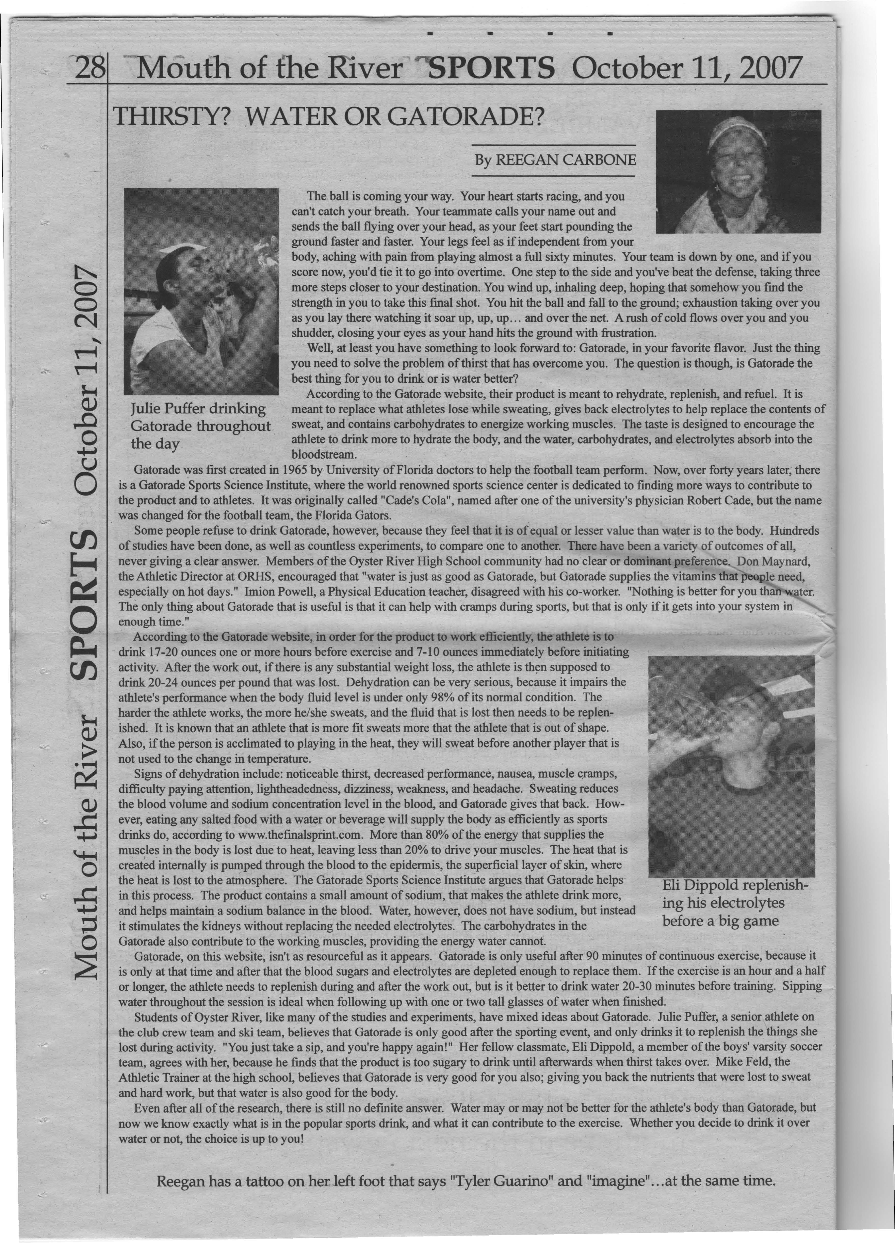 Students of Oyster River, like many of the studies and experiments, have mixed ideas about Gatorade. Julie Puffer, a senior athlete on the club crew team and ski team, believes that Gatorade is only good after the sporting event, and only drinks it to replenish the things she lost during activity. "You just take a sip, and you're happy again!" Her fellow classmate, Eli Dippold, a member of the boys' varsity soccer team, agrees with her, because he finds that the product is too sugary to drink until afterwards when thirst takes over. Mike Feld, the Athletic Trainer at the high school, believes that Gatorade is very good for you also; giving you back the nutrients that were lost to sweat and hard work, but that water is also good for the body.
