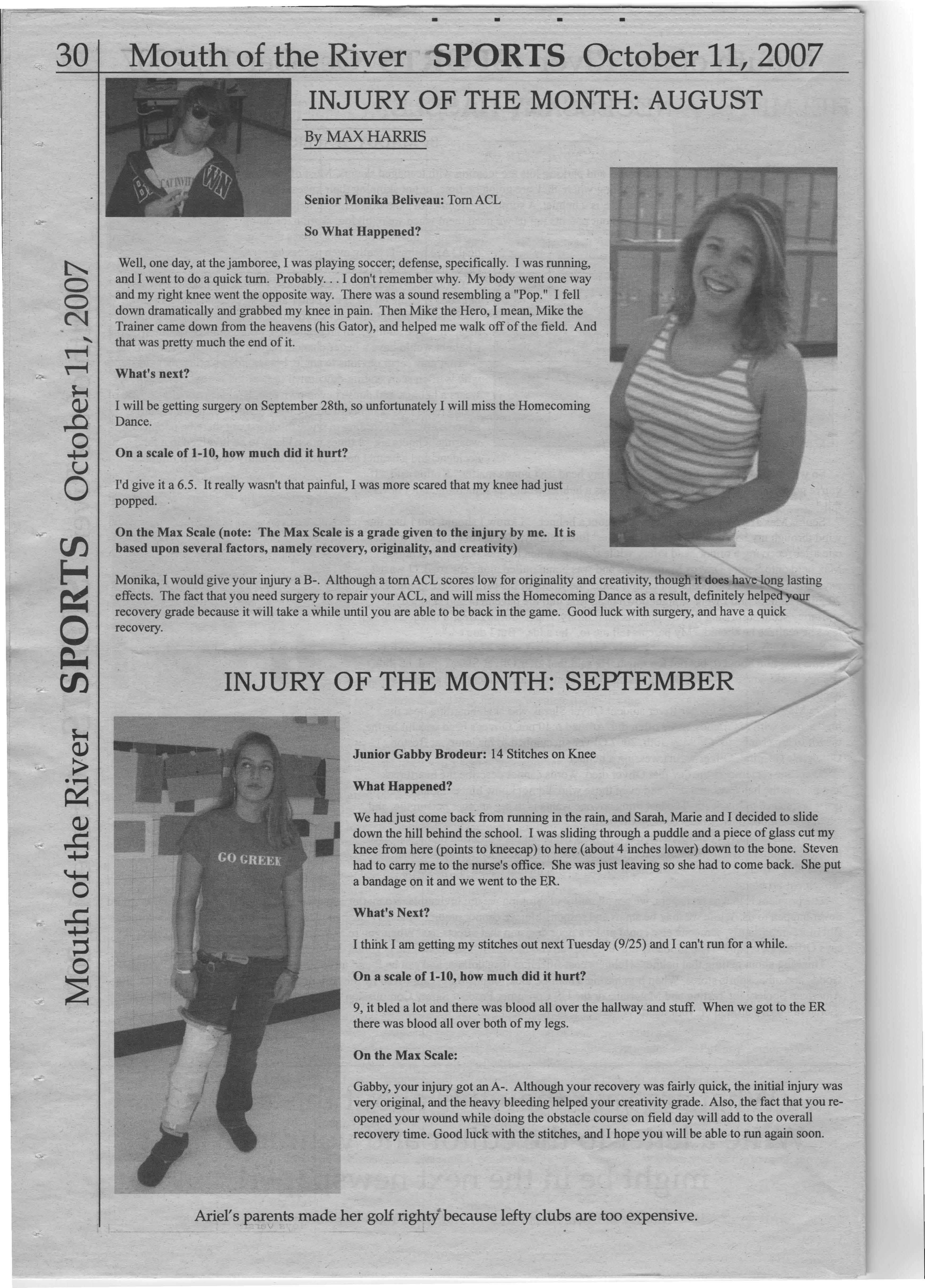 Monika, I would give your injury a B-. Although a tom ACL scores low for originality and creativity, though it does have-1Qng lasting effects. The fact that you need surgery to repair your ACL, and will miss the Homecoming Dance as a result, definitely helped your recovery grade because it will take a while until you are able to be back in the game. Good luck with surgery, and have a quick recovery.
