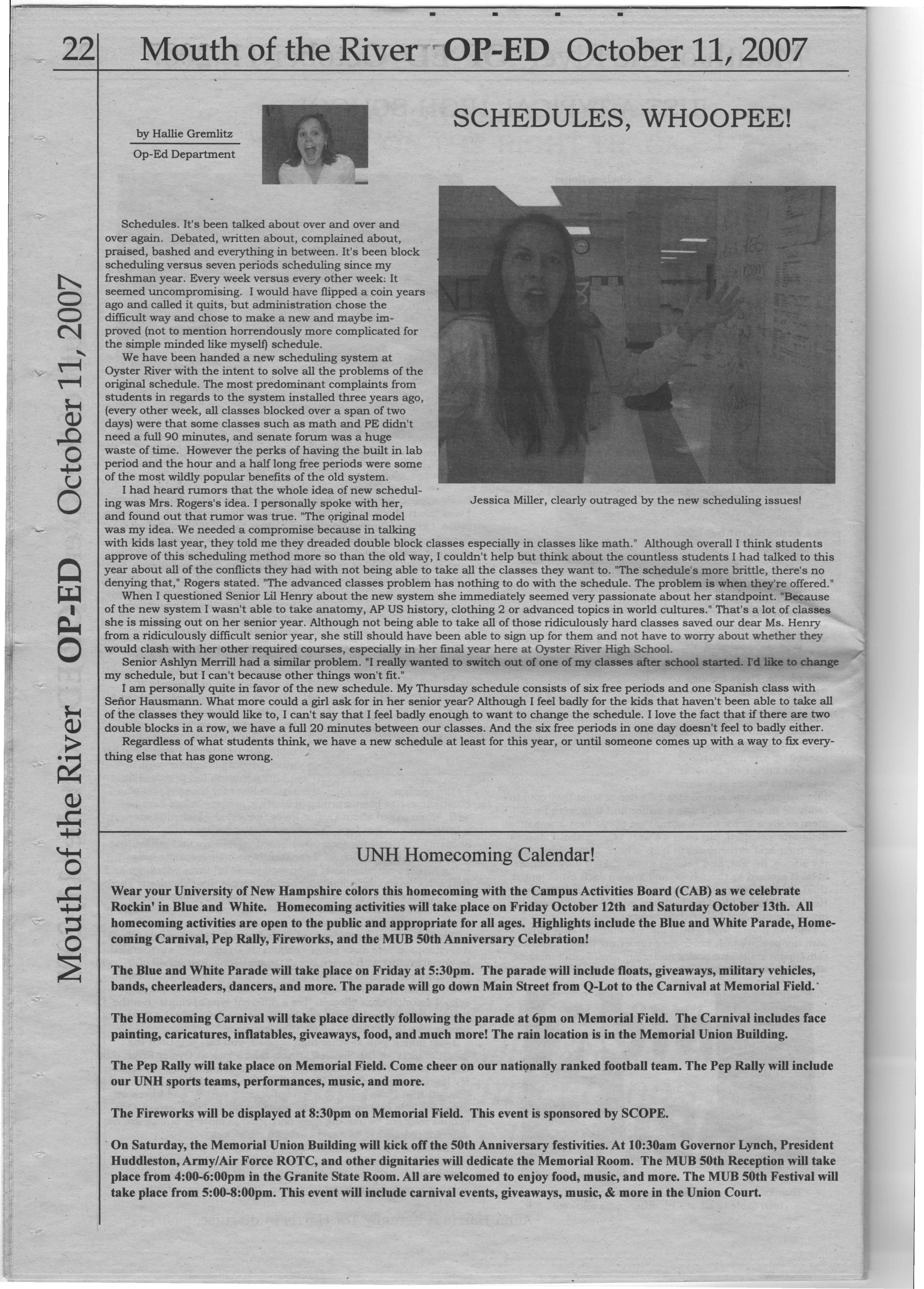 ing was Mrs. Rogers's idea. I personally spoke with her, Jessica Miller, clearly outraged by the new scheduling issuesl and found out that rumor was true. "The qriginal model was my idea. We needed a compromise because in talking with kids last year, they told me they dreaded double block classes especially in classes like math." Although overall I think students approve of this scheduling method more so than the old way, I couldn't help but think about the countless students I had talked to this year about all of the conflicts they had with not being able to take all the classes they want to. "The schedule's more brittle, there's no denying that," Rogers stated. "The advanced classes problem has nothing to do with the schedule. The problem is when they're offered."