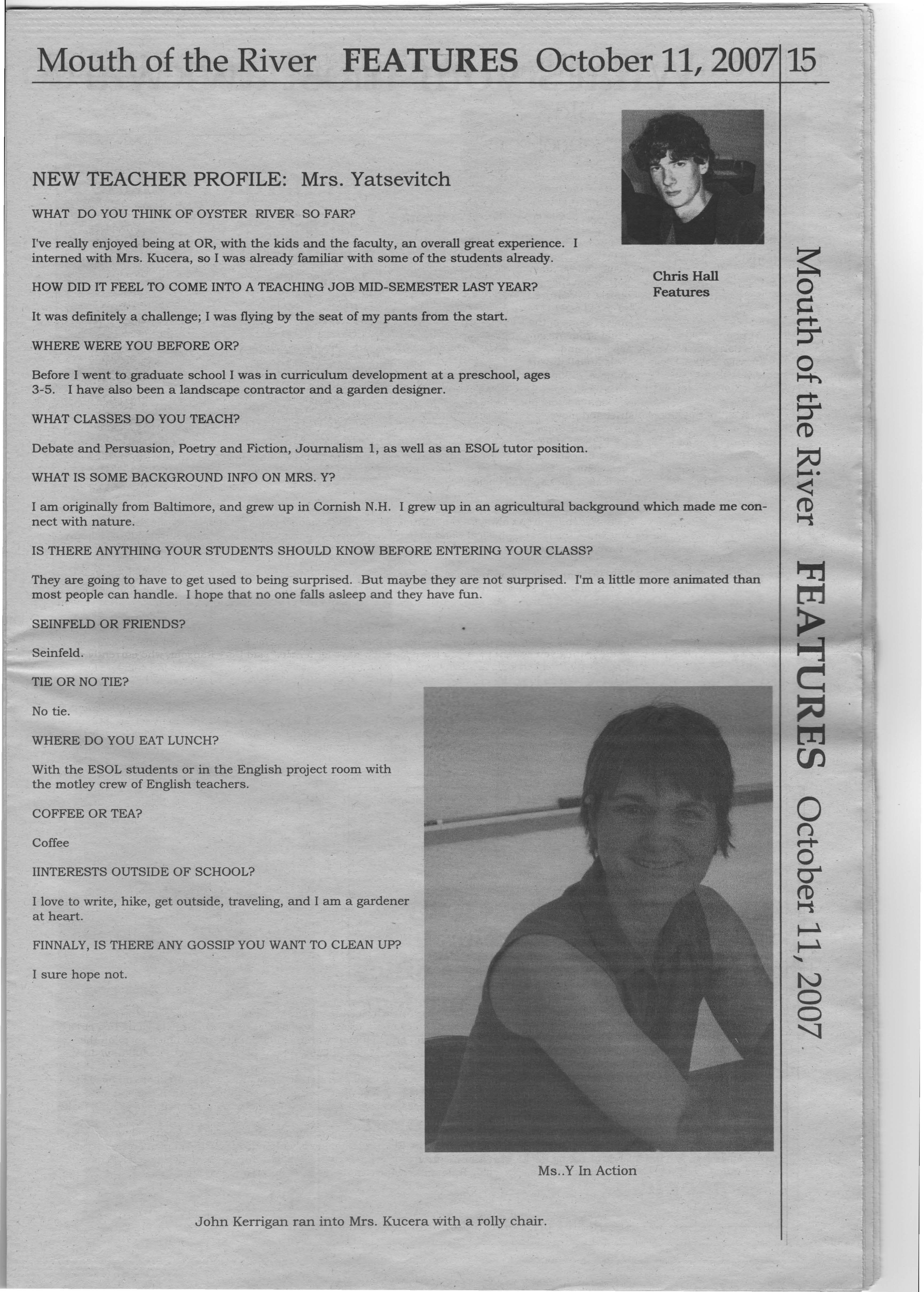 "I love white water kayaking and just being outside in general," said Kim Seamon, one of Oyster River's new guidance counselors. "My favorite place to white water kayak is the Ottawa river in Canada. Sometimes I kayak in the winter when there's still snow on the sidings. It's an automatic ice cream freeze," says Seamon.