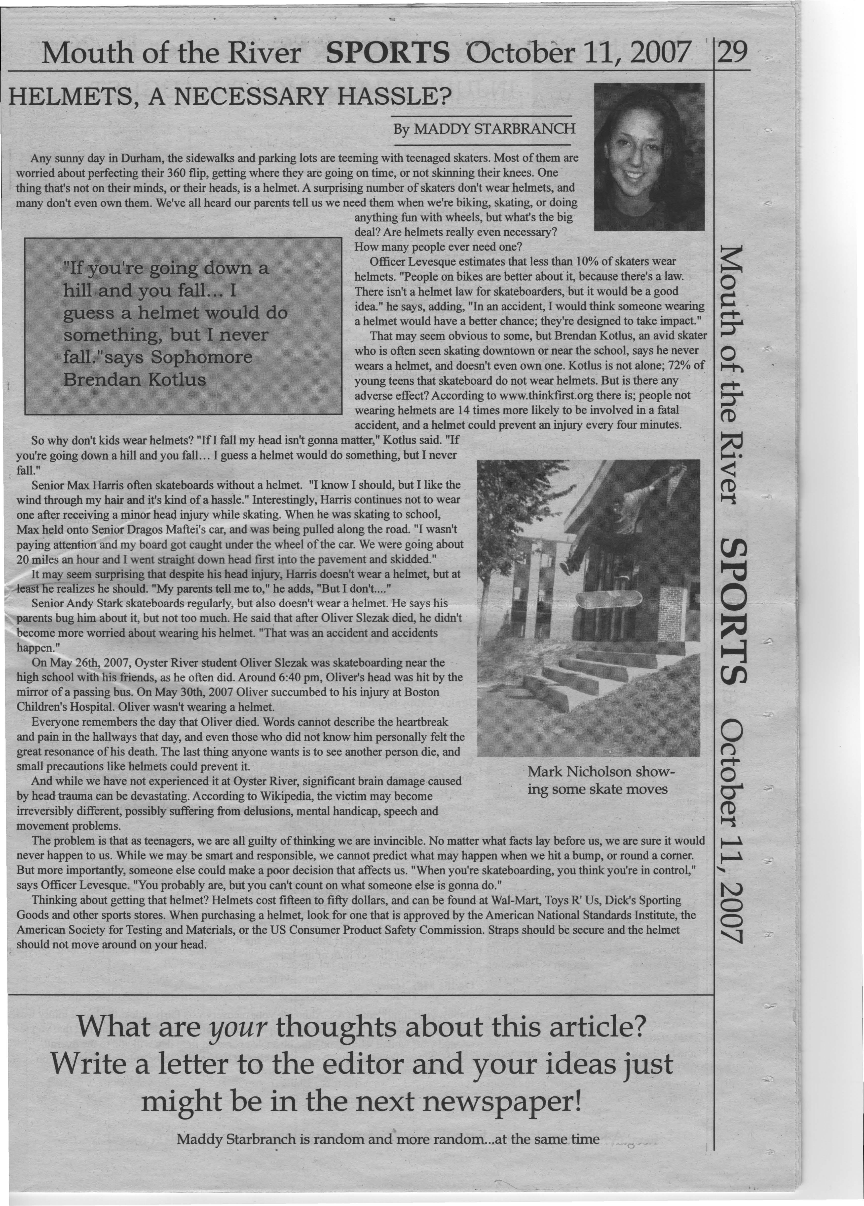 On May 26th, 2007, Oyster River student Oliver Slezak was skateboarding near the high school with his friends, as he often did. Around 6:40 pm, Oliver's head was hit by the mirror of a passing bus. On May 30th, 2007 Oliver succumbed to his injury at Boston Children's Hospital. Oliver wasn't wearing a helmet.